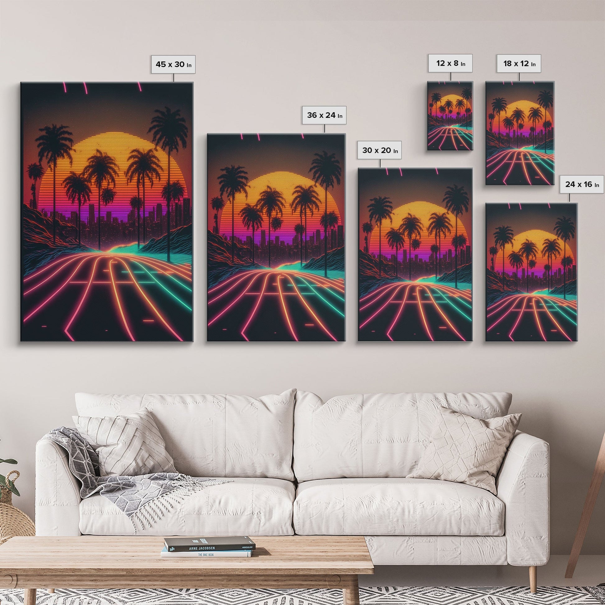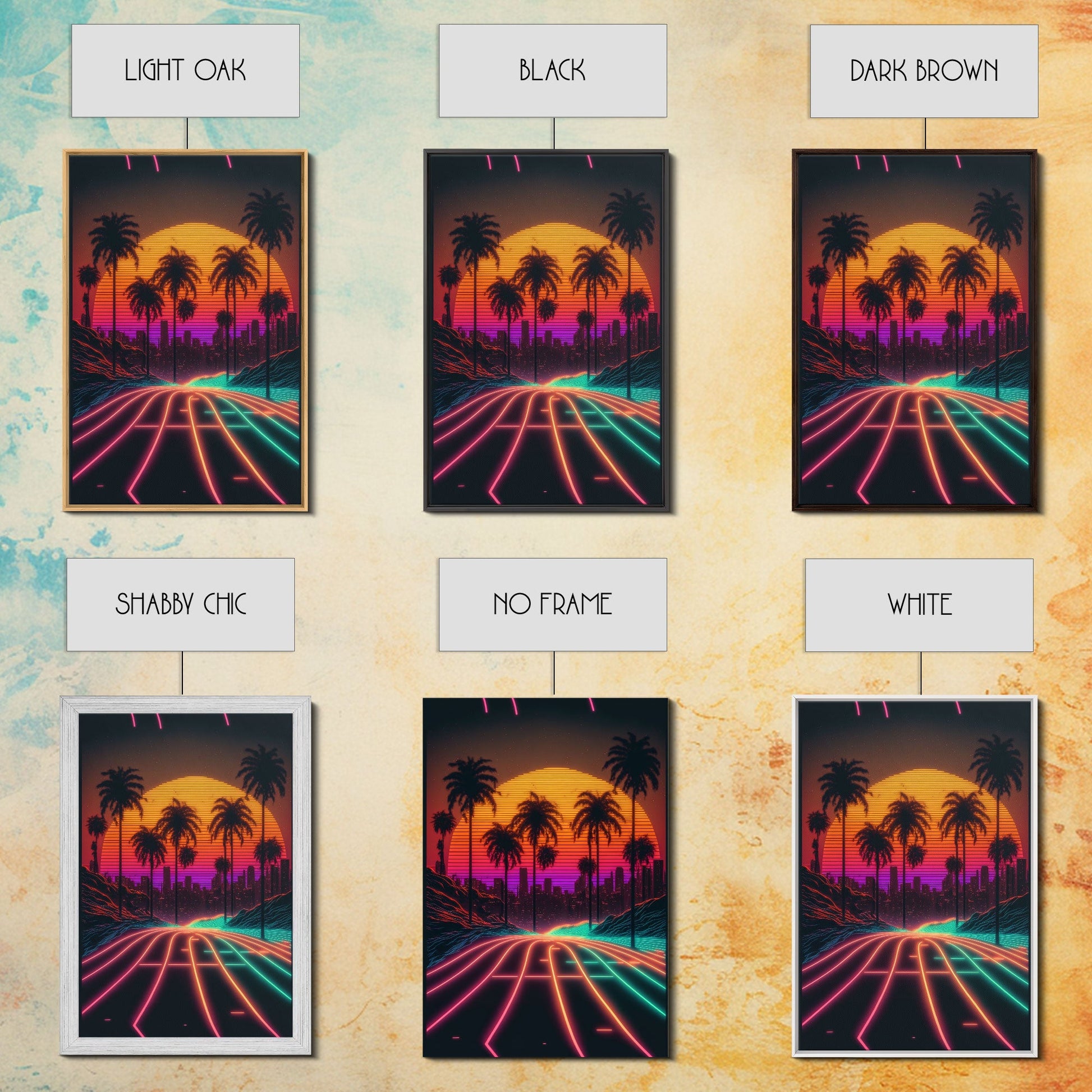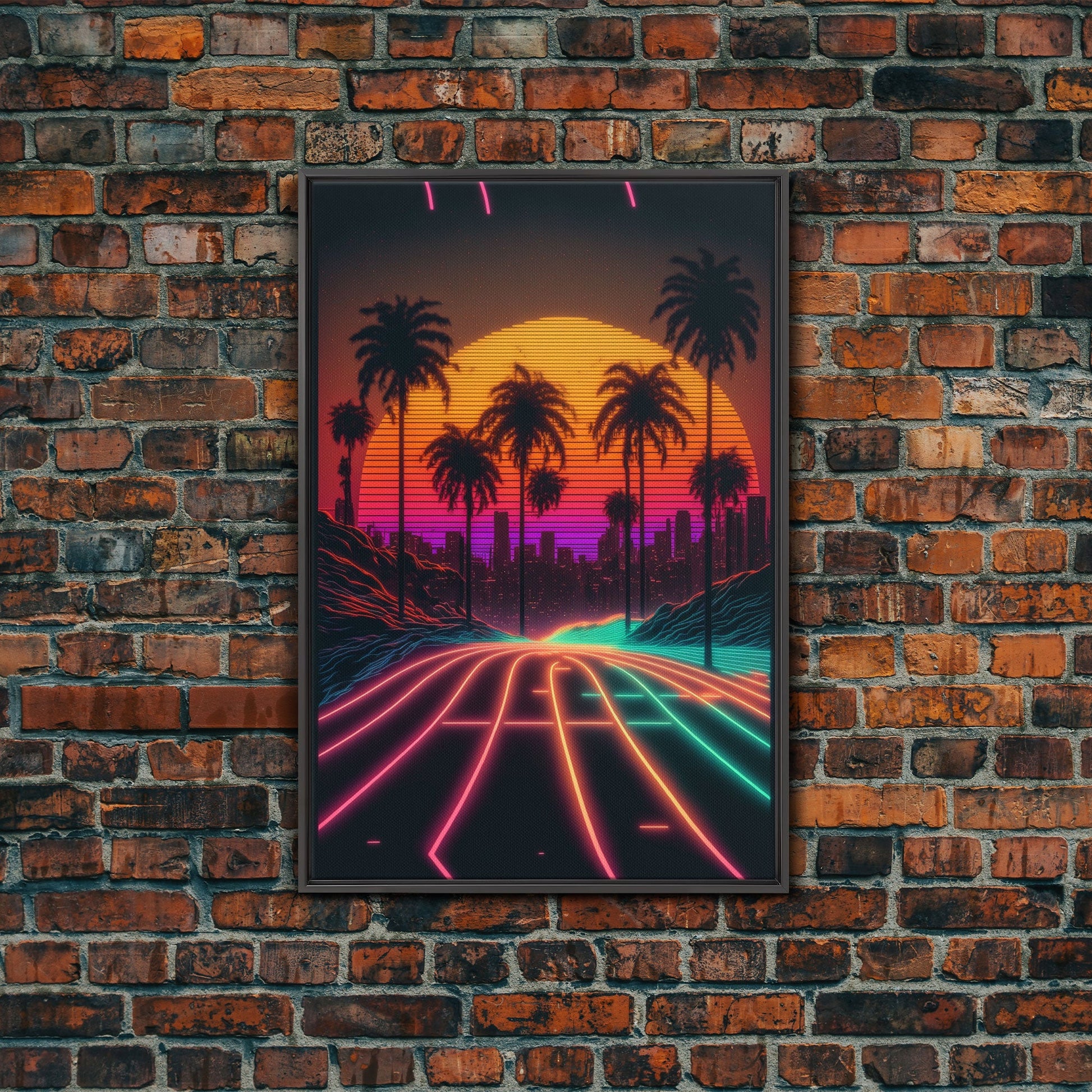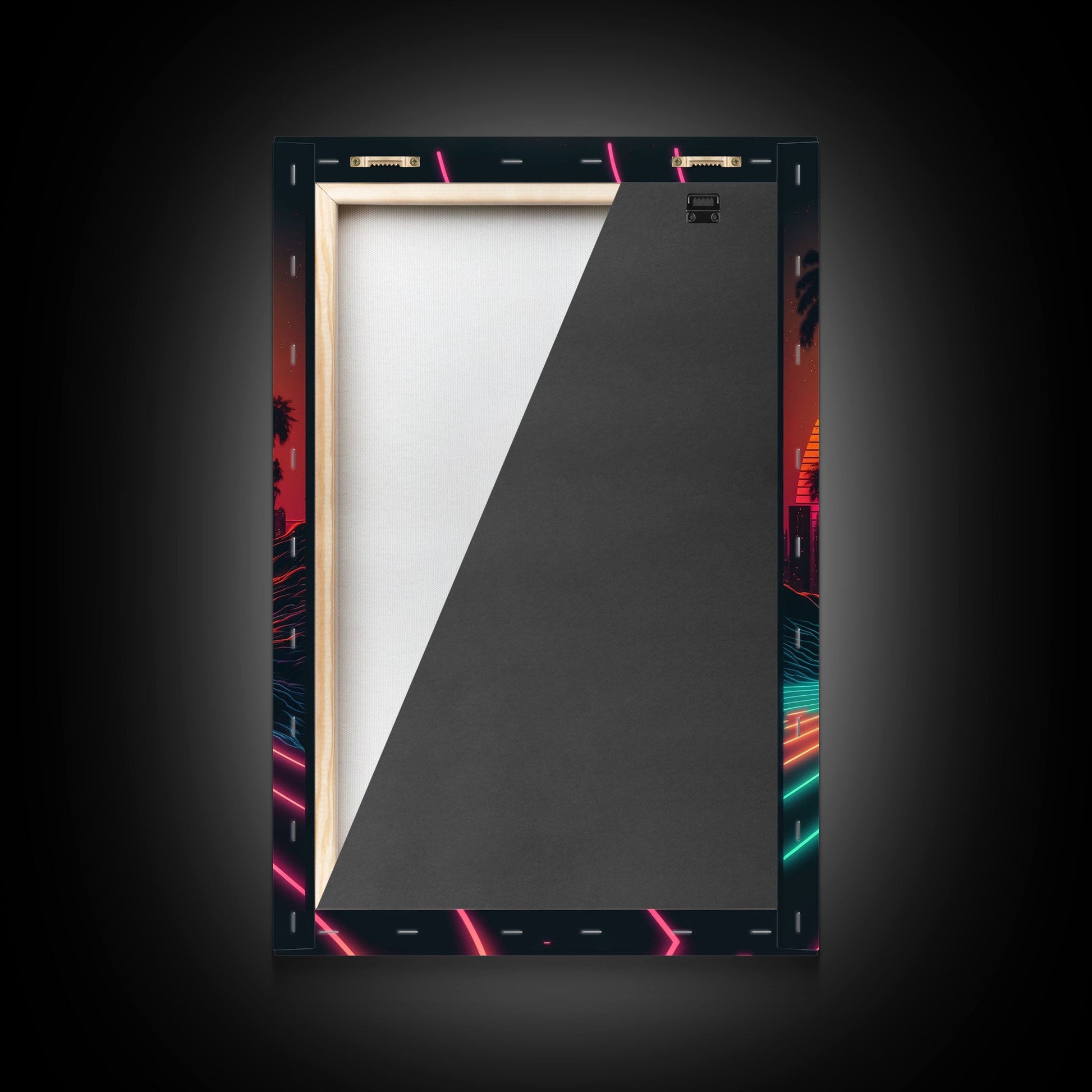 Neon Wireframe Road at Sunset, Outrun / Synthwave Palm Tree Art, 80s Retro Inspired Art, Framed Canvas Print