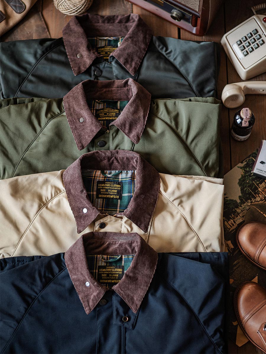 It is sleek, with flush patch pockets and plunge pockets that are cut into the seams. dark brown corduroy on the collar and cuffs . The beautiful copper hardware contrasts nicely with the rich Green fabric. Zippers are smooth.