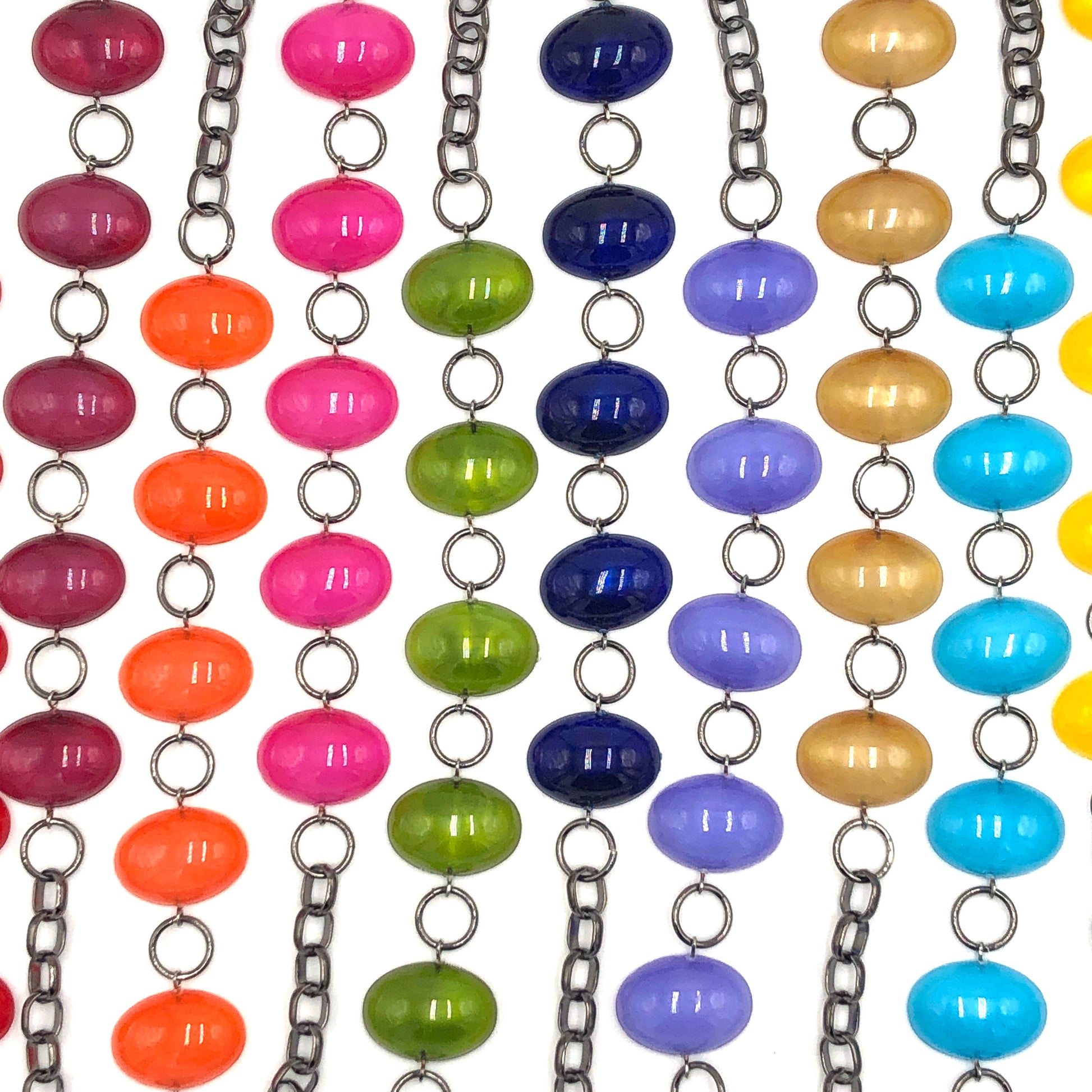 Lucite stations bracelet featuring olive green aura glow oval shapes & links in your choice of gritty gun metal or frosted gold links and chain. The Stations Bracelet is adjustable from 6 to 10". Enough of a statement to be worn on its own OR stack for an arm party with others. Lots of versatility and the swivel lobster claw makes it so that you can latch a link all by yourself. Light weight with a chunky look.