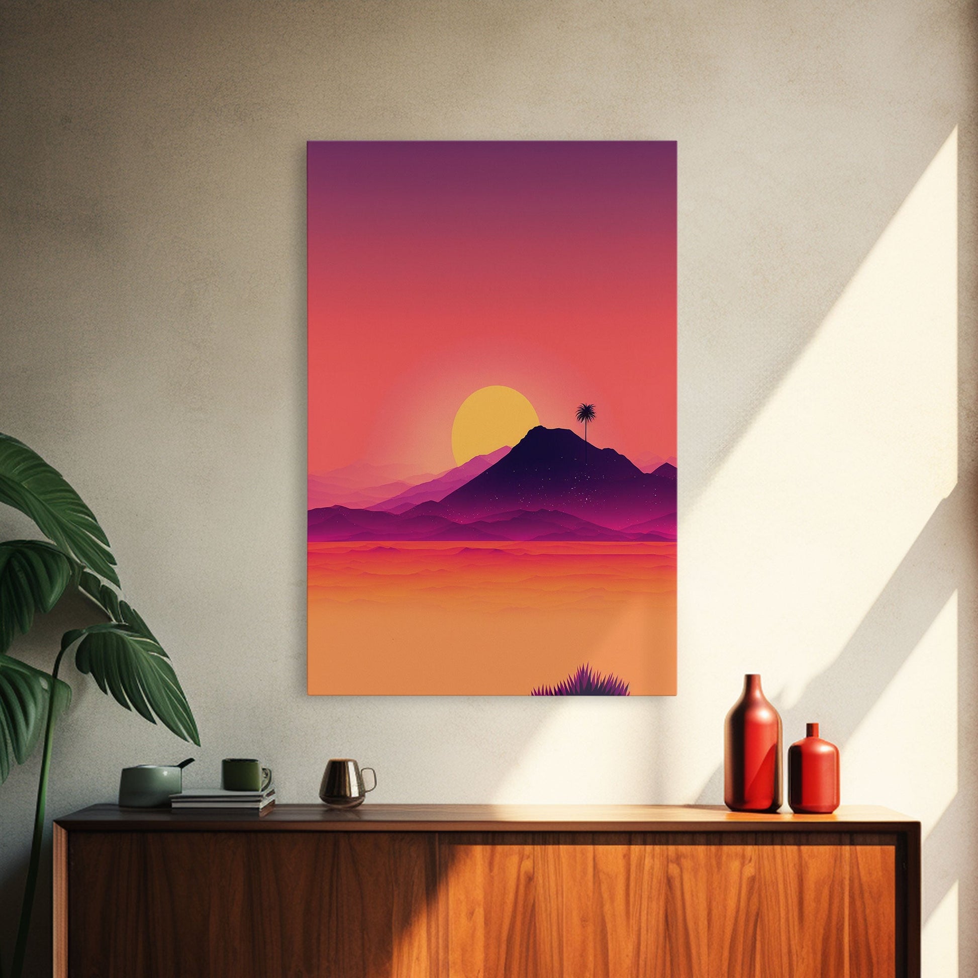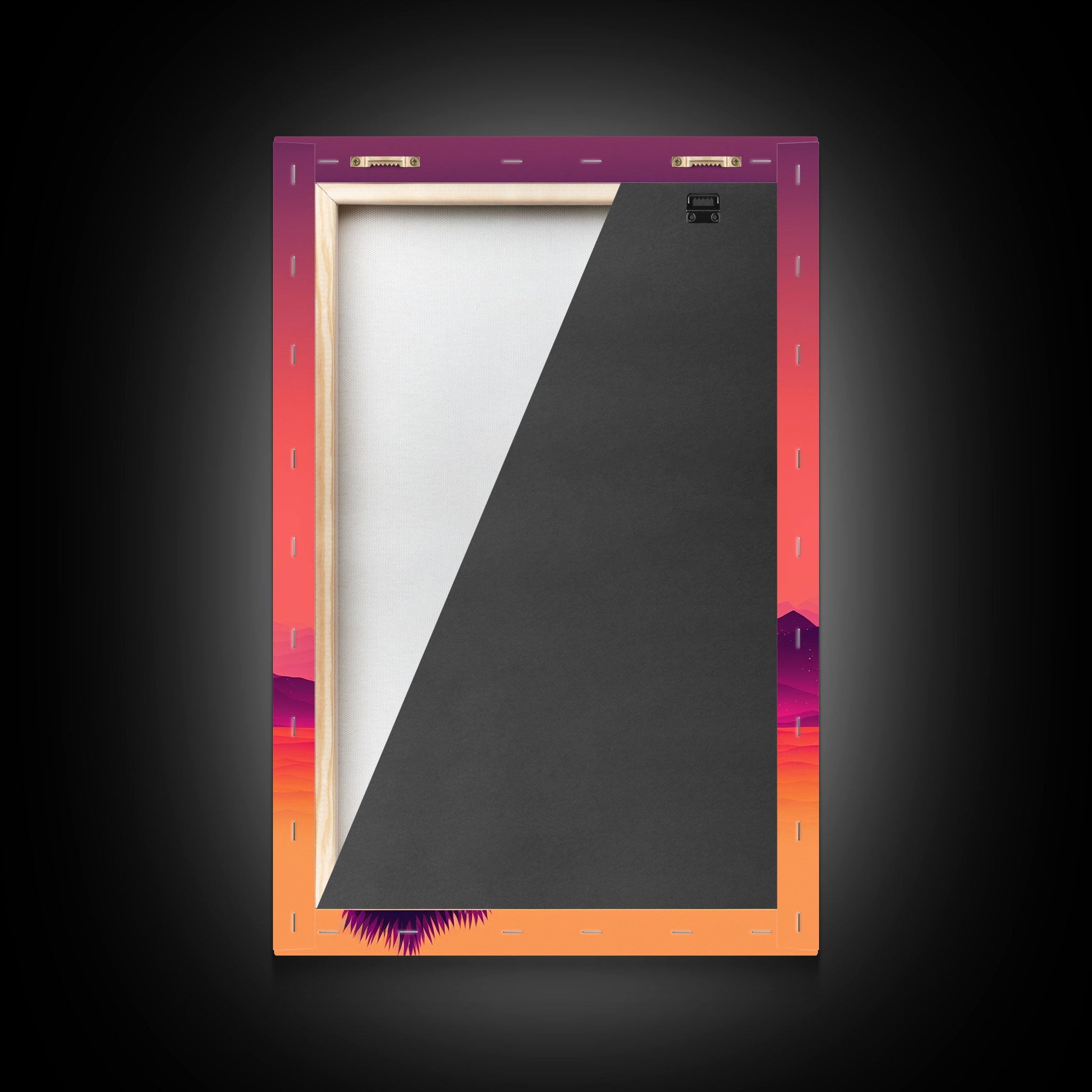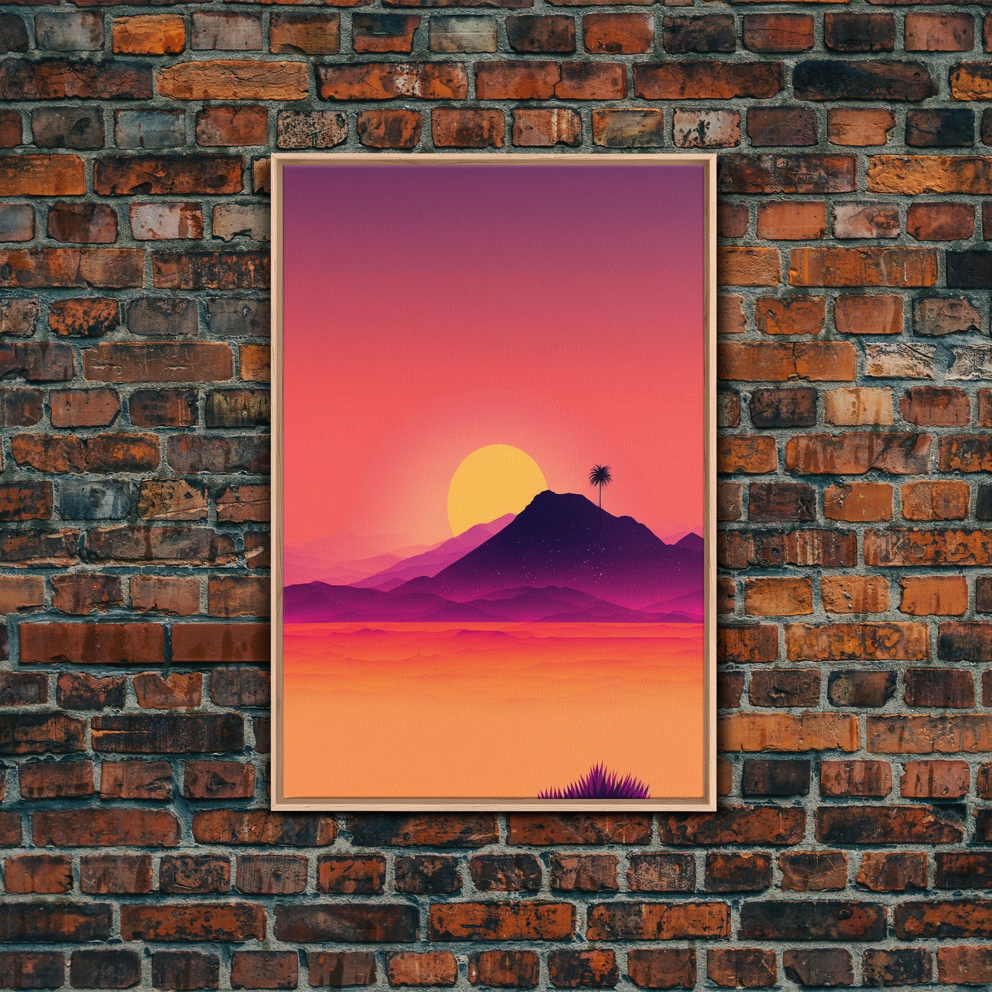 Outrun Style Desert Sunset, Framed Canvas Print, Retro Style 80s Vibe Wall Decor, Office Art, Game Room Decor, Living Room Gamer Art