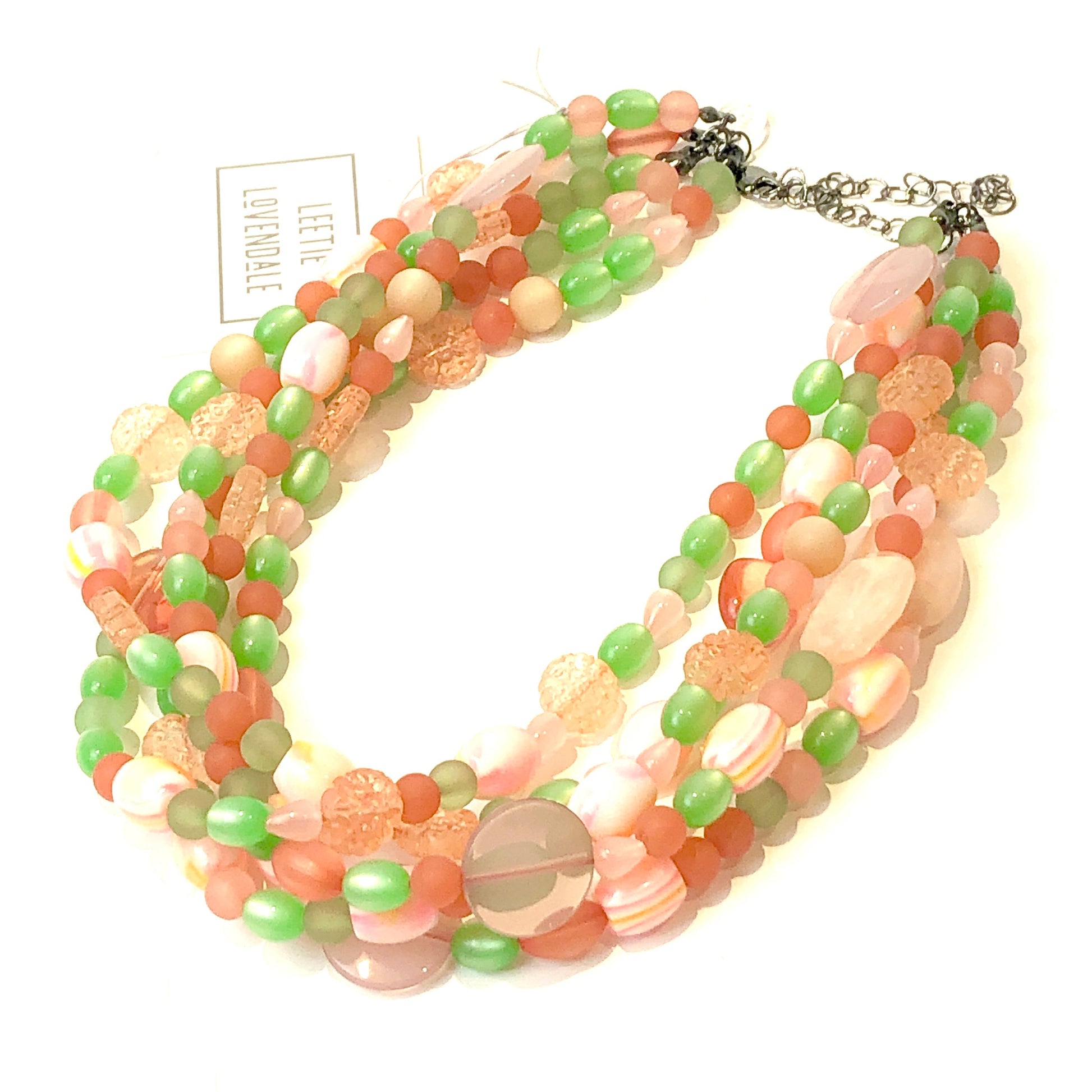 Shades of peach and coral are mixed with varied hues of bright moonglow green and light pinks. Shiny & matte, textured vintage beaded statement necklace. The beads in this necklace are varied in shape & size for a great, textured look. Beads are shiny opaque finish in that great retro look & they were made in the 1960s. The necklace measures 15.5-16" at its shortest + a 6" extender. Lightweight and fun to wear: a classic style that will outlast trends.