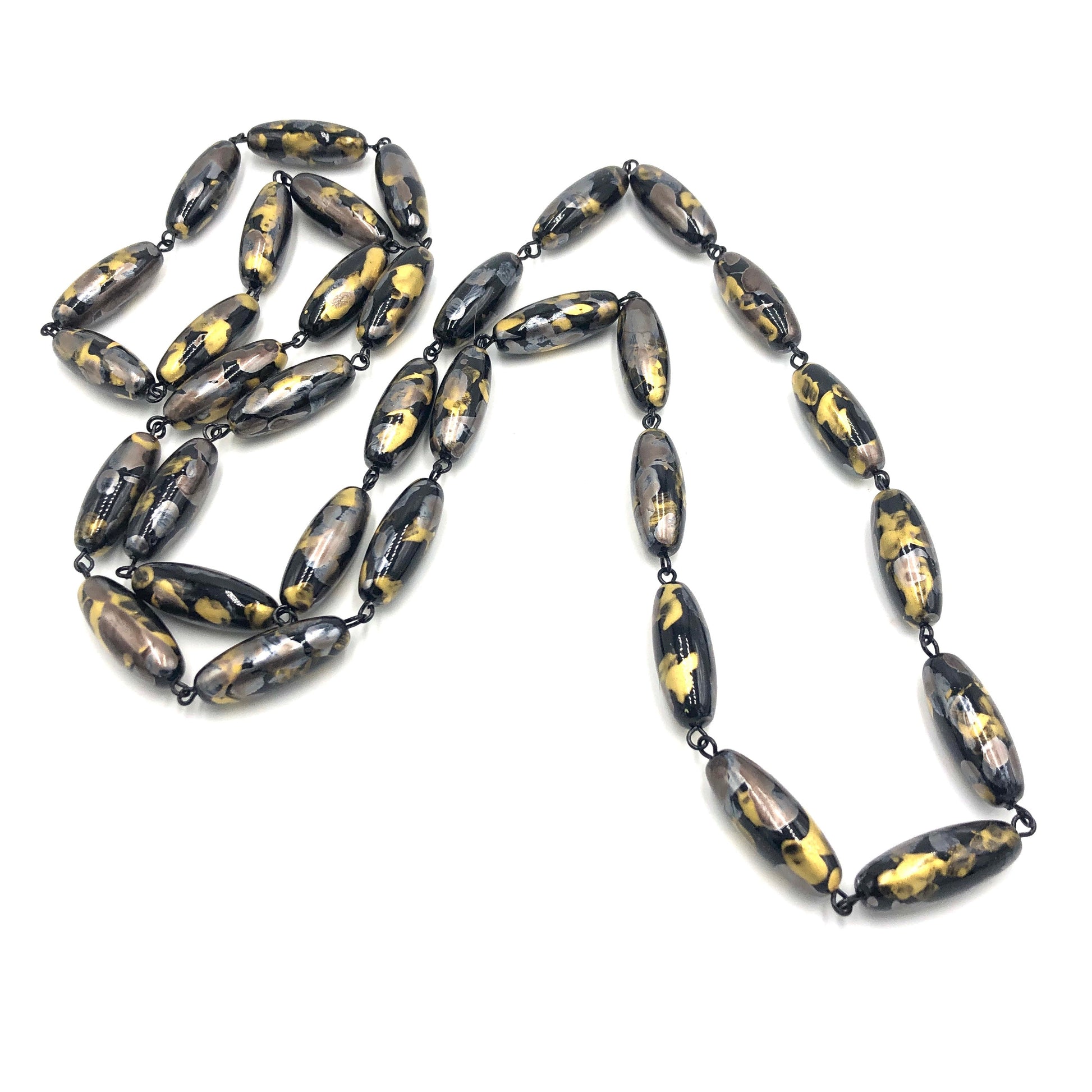 Pewter & metallic gold painted on black beads. Each bead is linked by hand with black chain. Beads vintage & metal over lucite. Necklace measures 48" in length & can be worn long and lean or doubled for a shorter statement look. A great versatile style.
