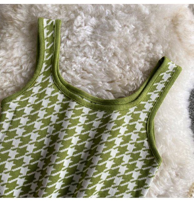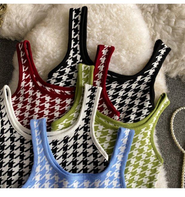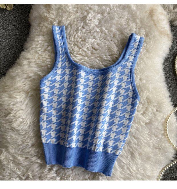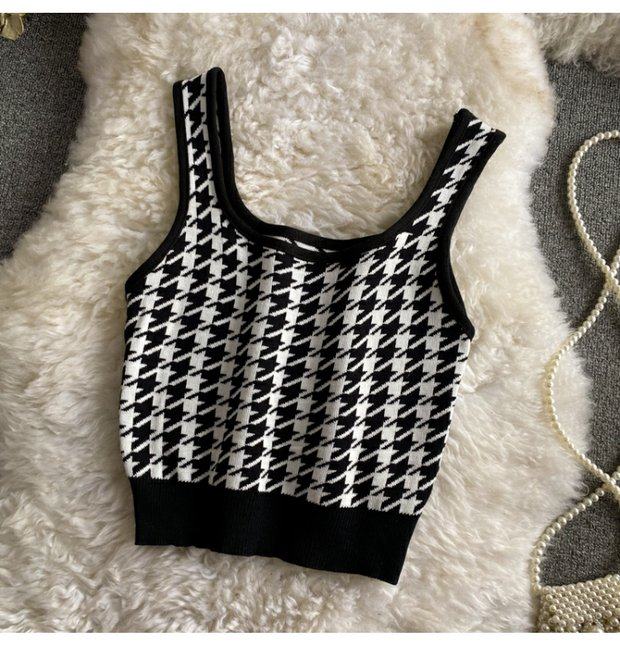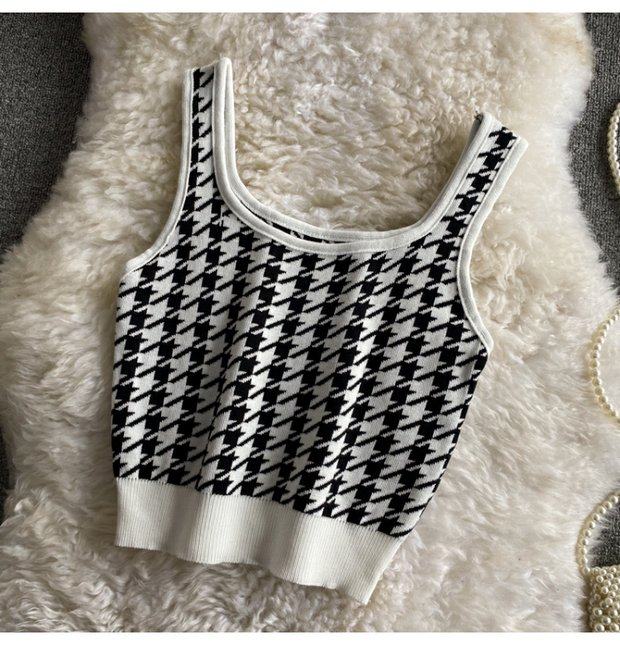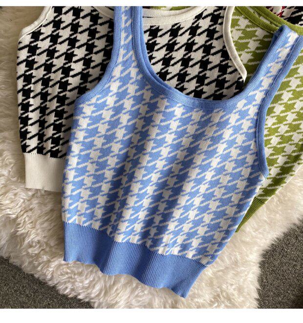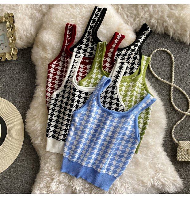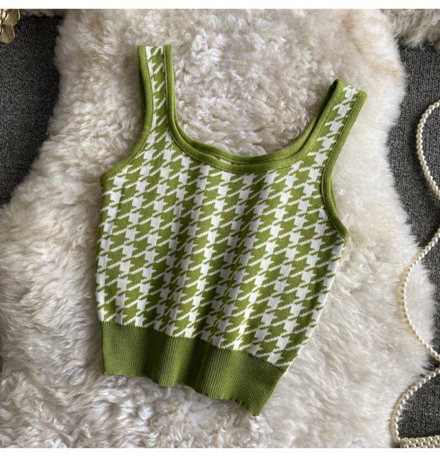 Plaid Knitted Camisole Summer New Retro Slim Fit Stretchy Slim Short Crop Top Women's Clothing