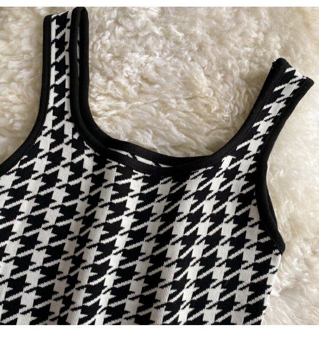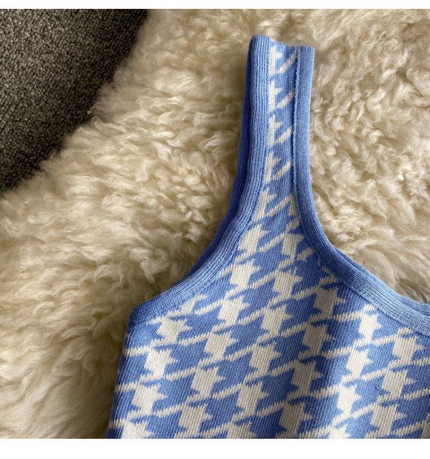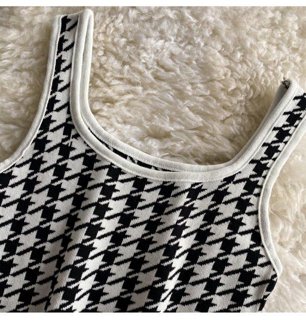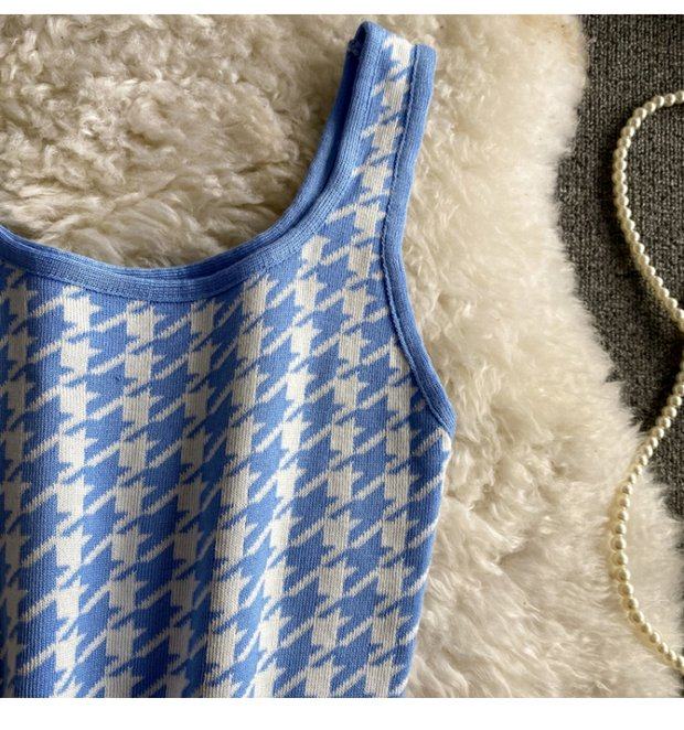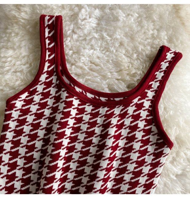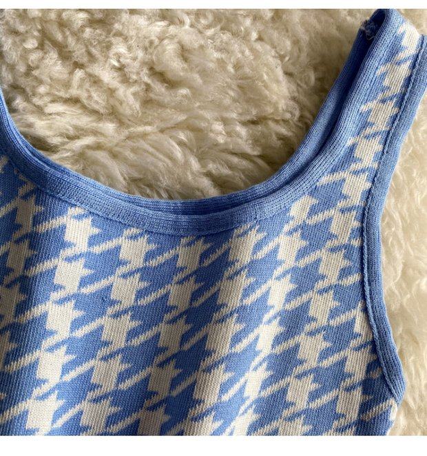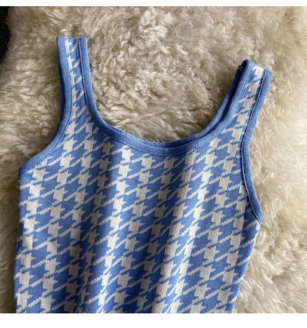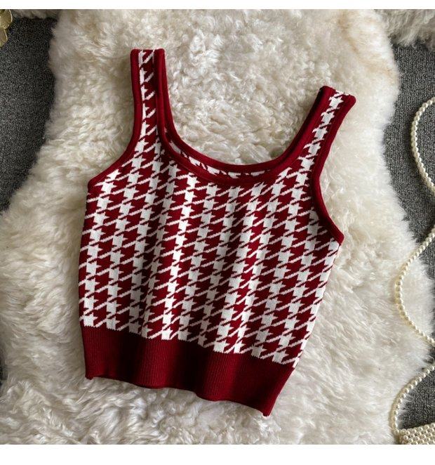 Plaid Knitted Camisole Summer New Retro Slim Fit Stretchy Slim Short Crop Top Women's Clothing