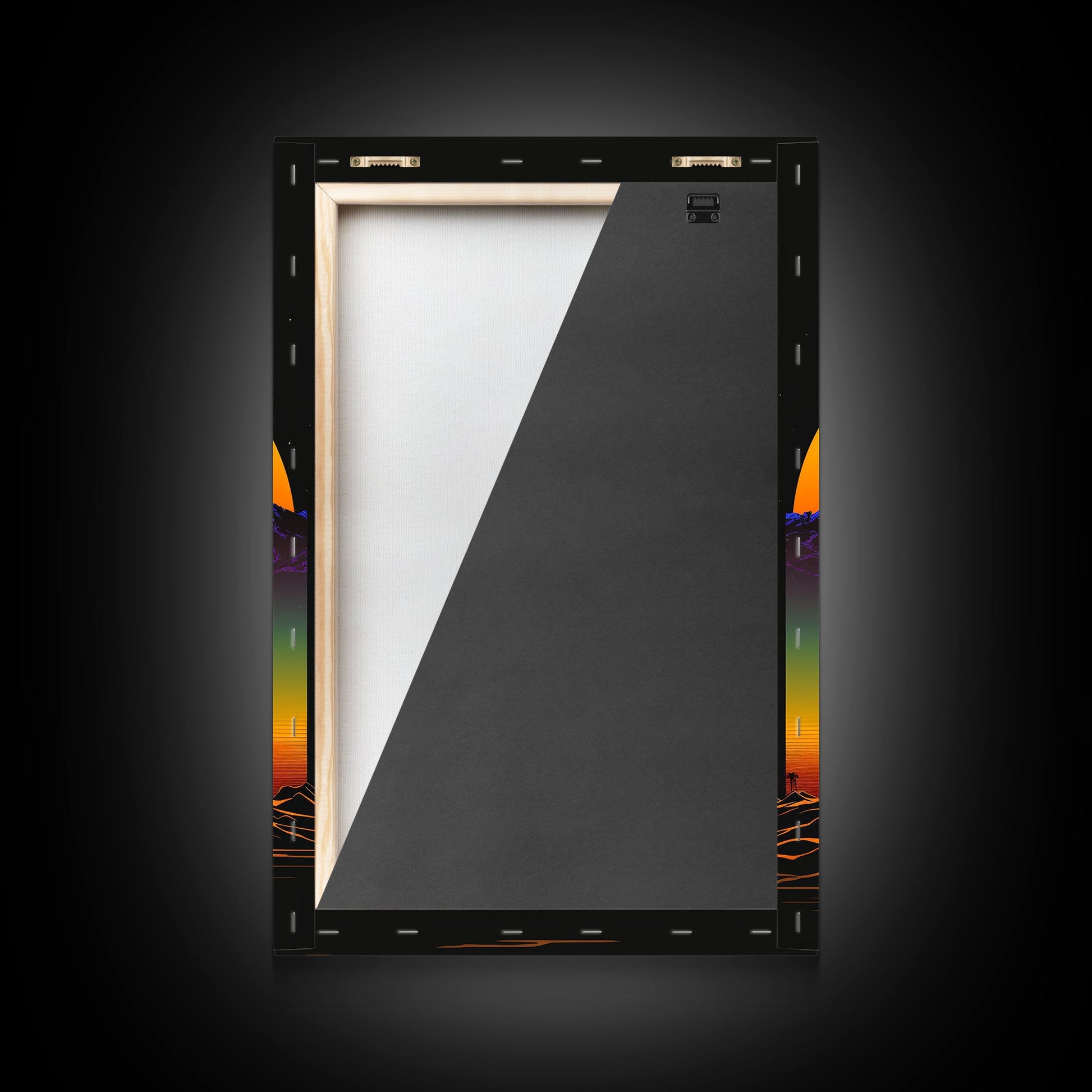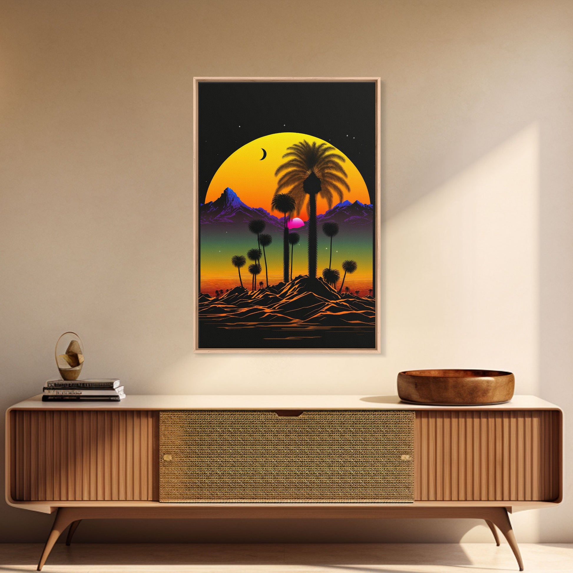 Pop Art Framed Canvas Print of Desert Landscape at Sunset, Outrun Style Sunset Full Moon Art, Unique 80s Vibe Retro Art