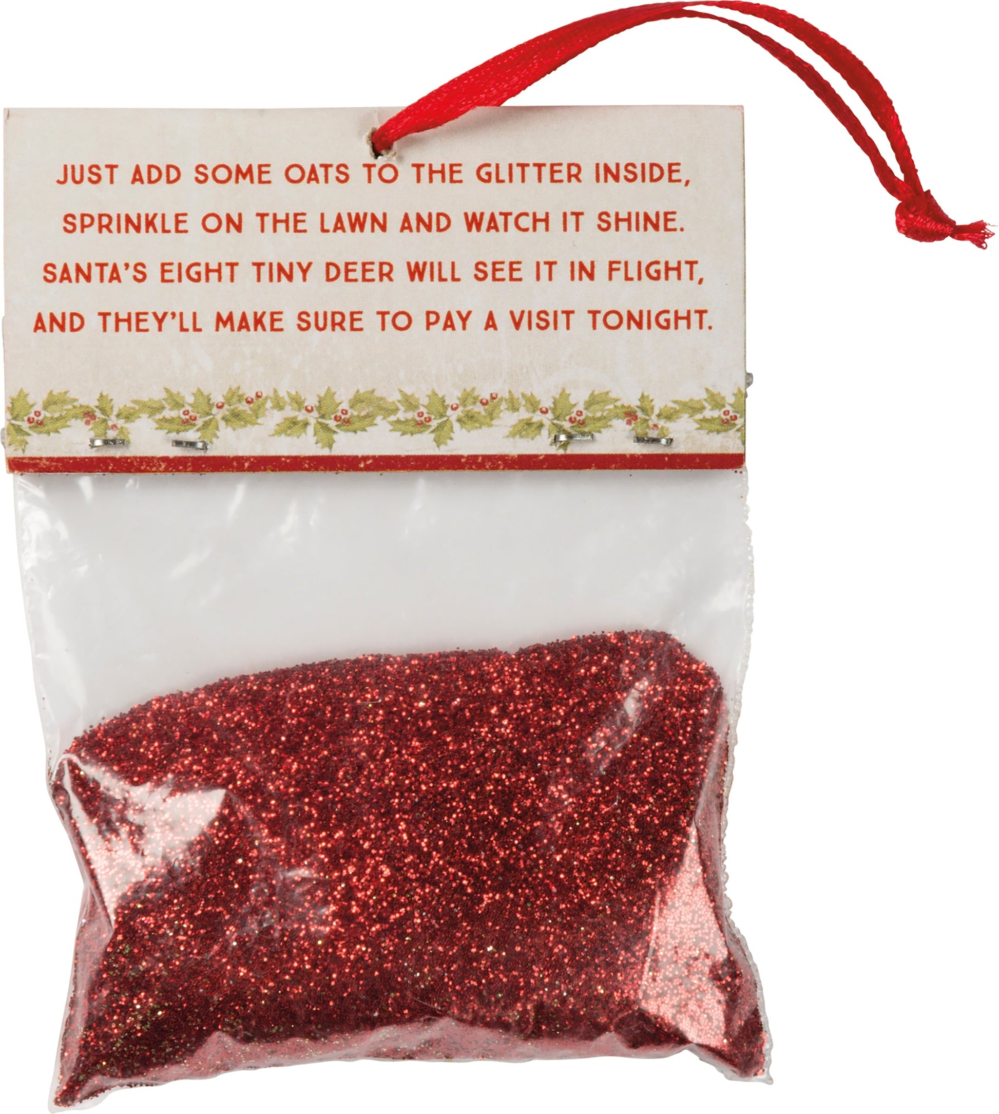 A timeless holiday staple piece, this "Kris Kringle's Best Reindeer Feed" hinged box is a fun tradition to add to the holidays! Containing magical reindeer feed, simply mix oats into the glitter and sprinkle outside to attract and feed Santa's reindeer! Oats not included.