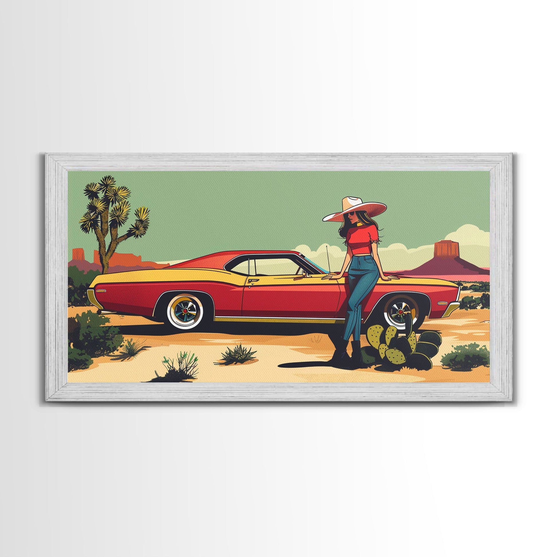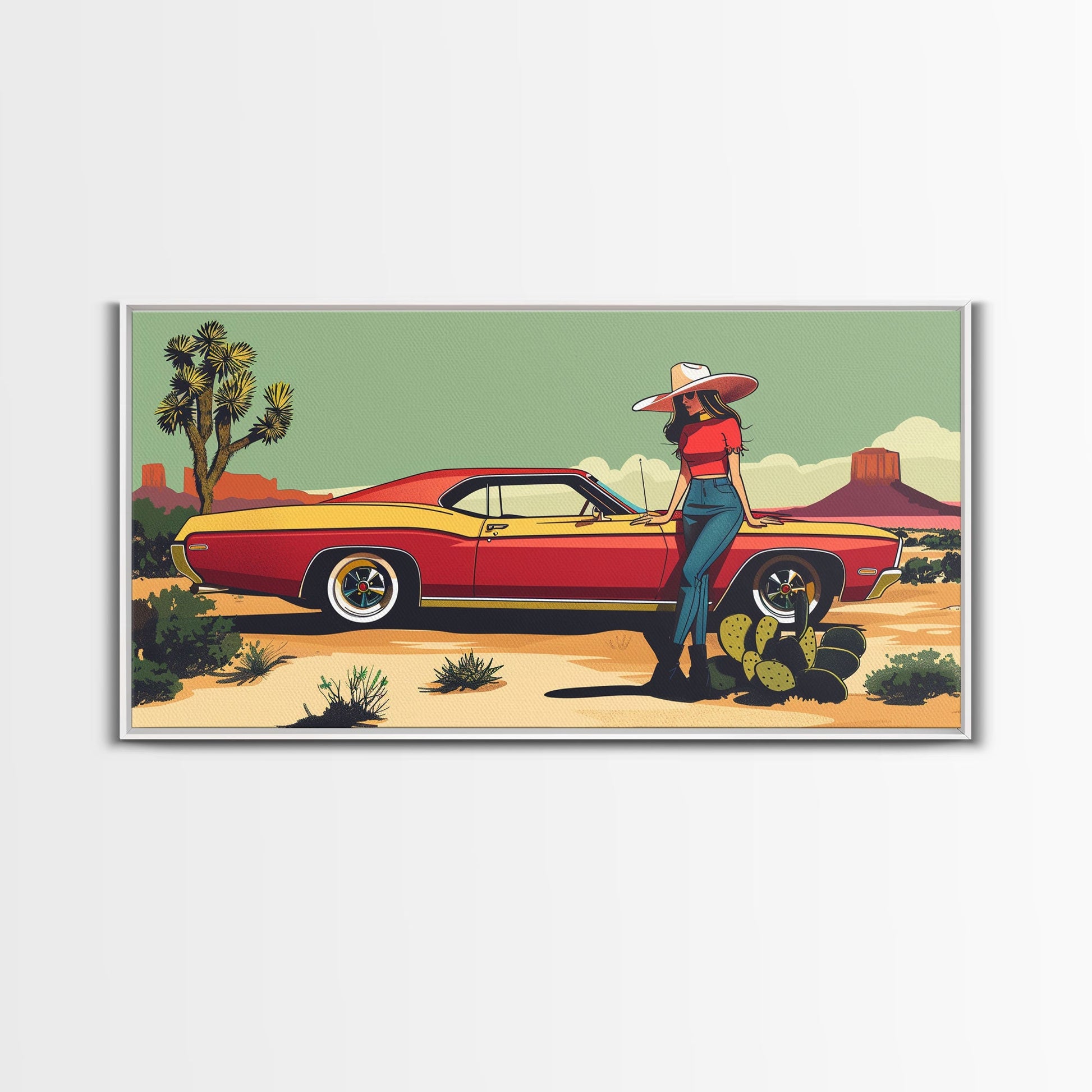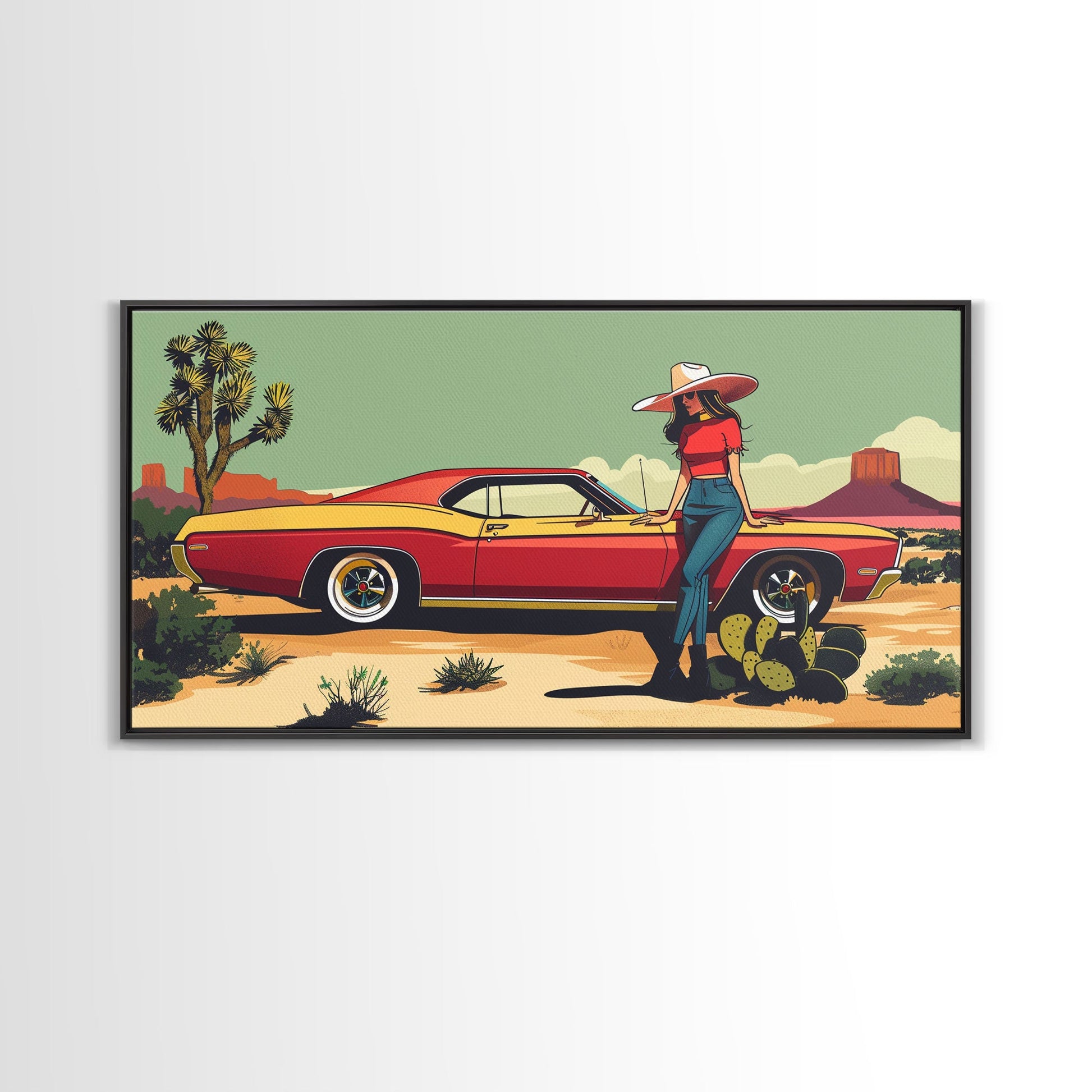 Retro Cowgirl with Red Car in Desert Landscape, Framed Canvas Print for Stylish Living Room Decor, Ideal Bedroom Wall Art