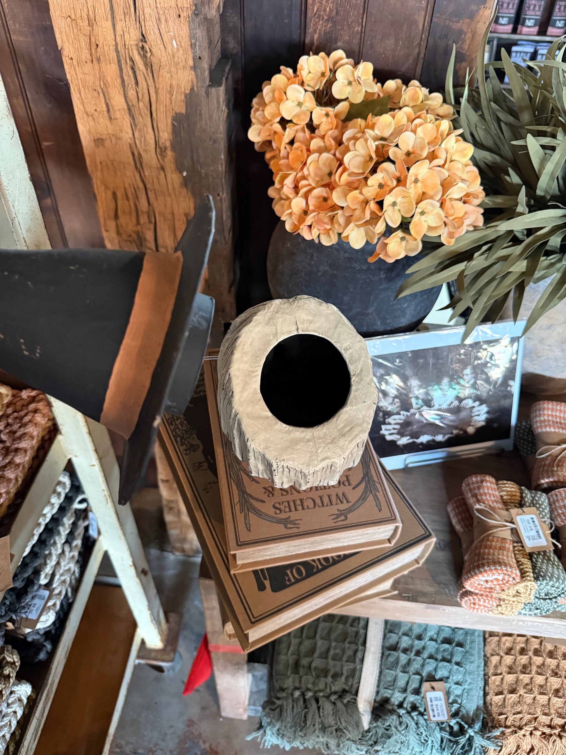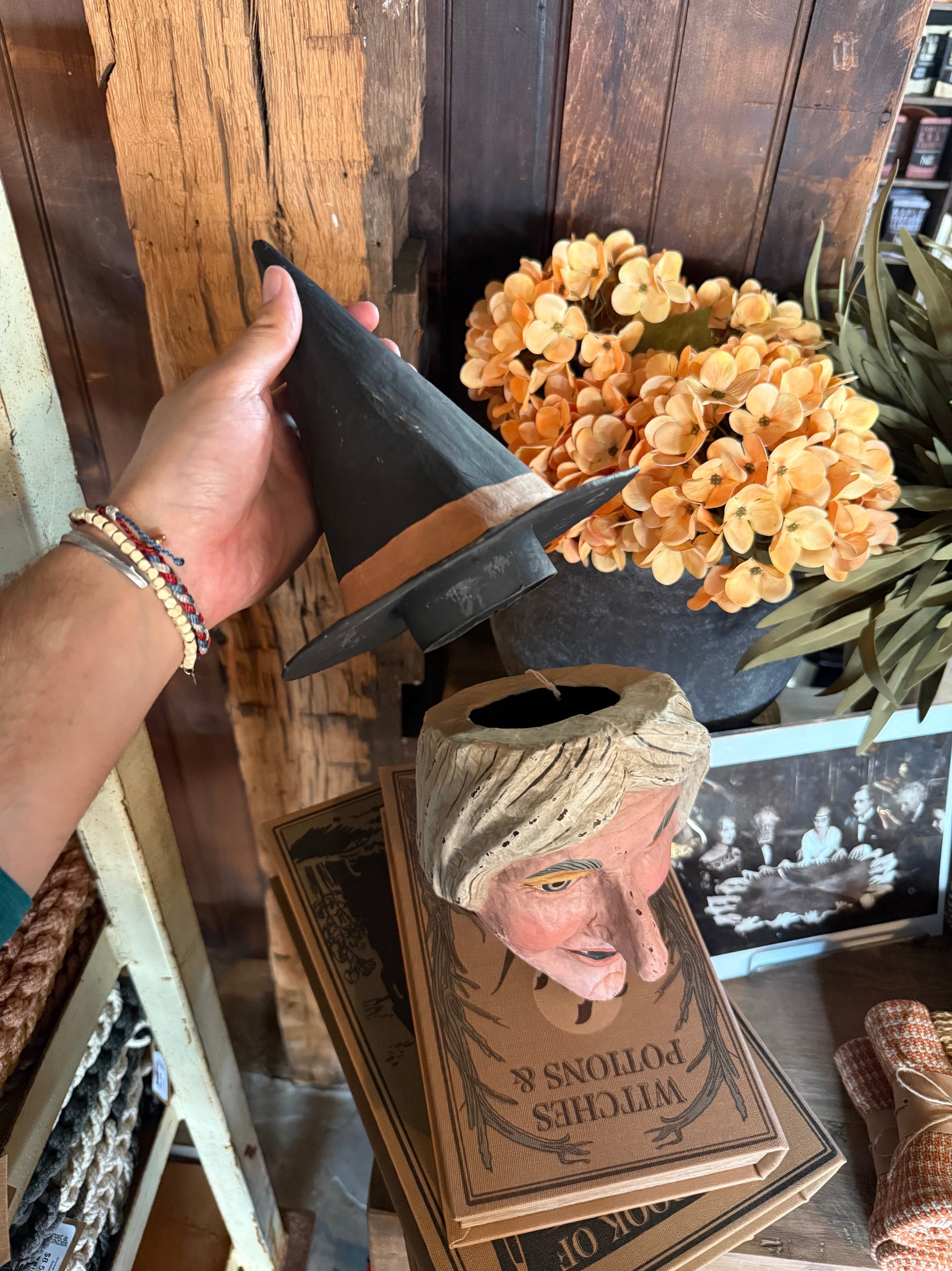Add eerie vintage charm to your seasonal décor with this Halloween hag witch. Made from paper mache, this piece captures the spooky essence of classic Halloween with its gnarled features, pointed hat, and hand-painted details. Compact yet full of character, it’s perfect for tabletops, shelves, or as part of a larger haunted display.