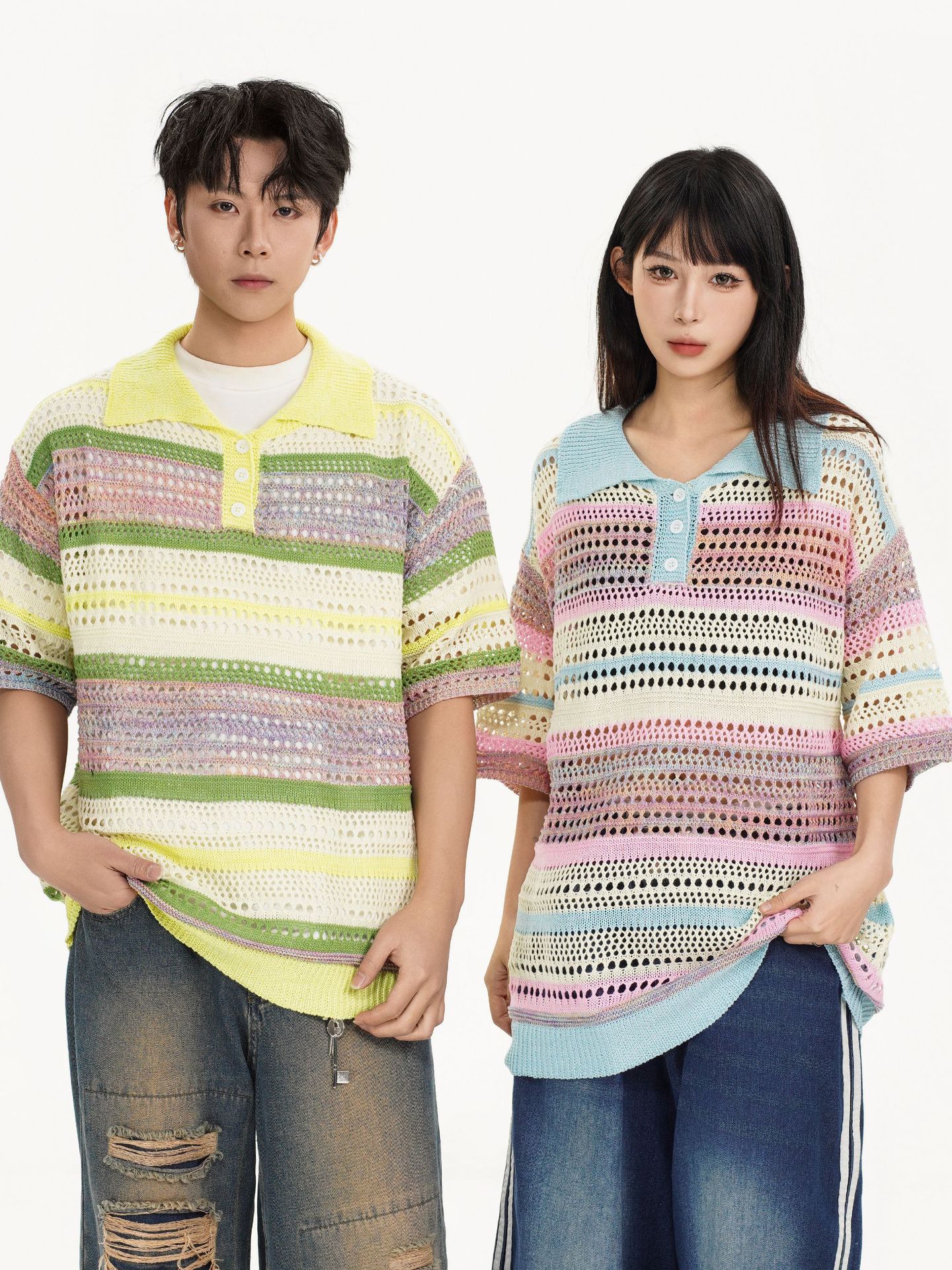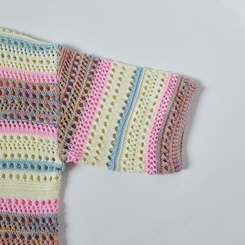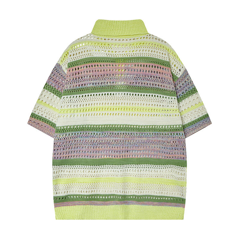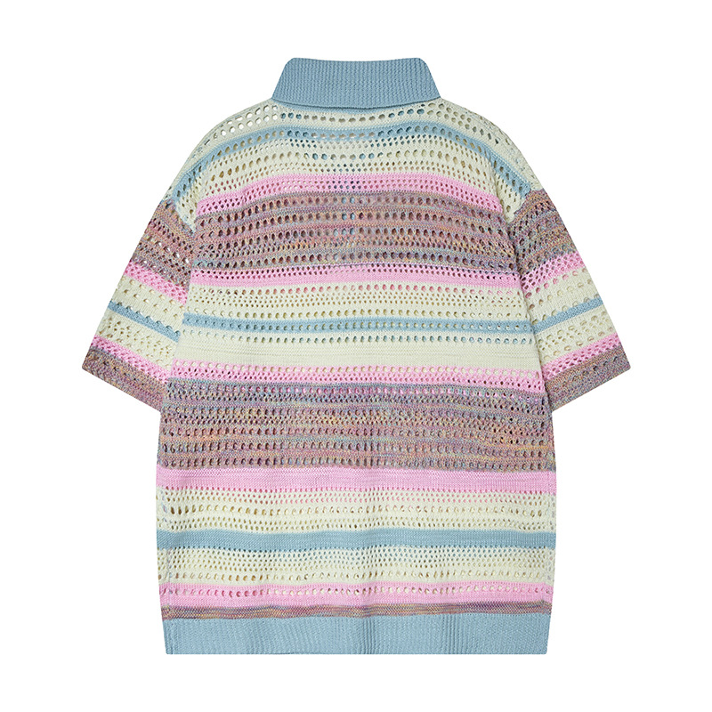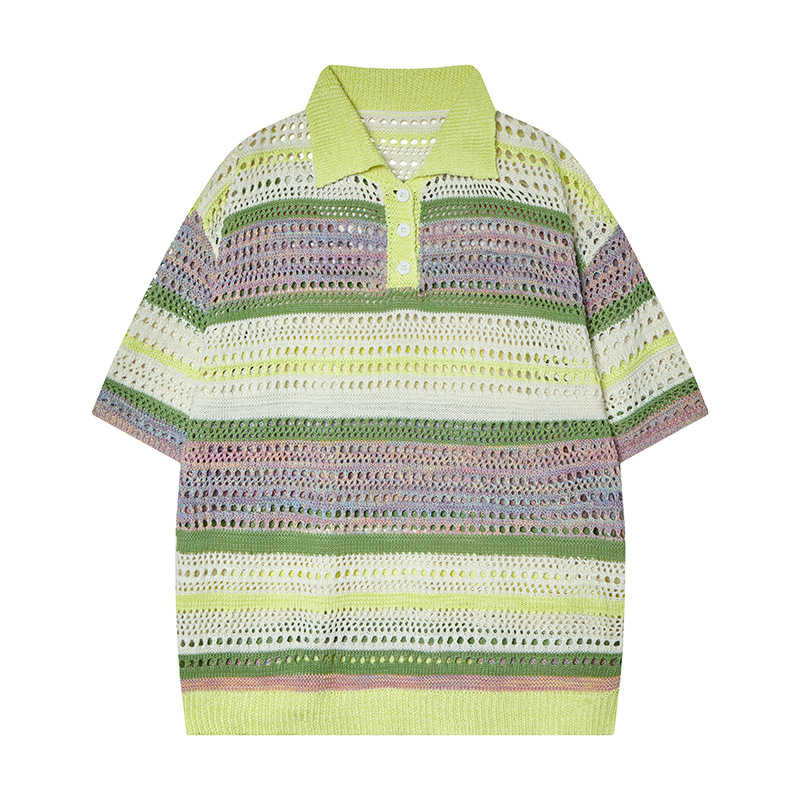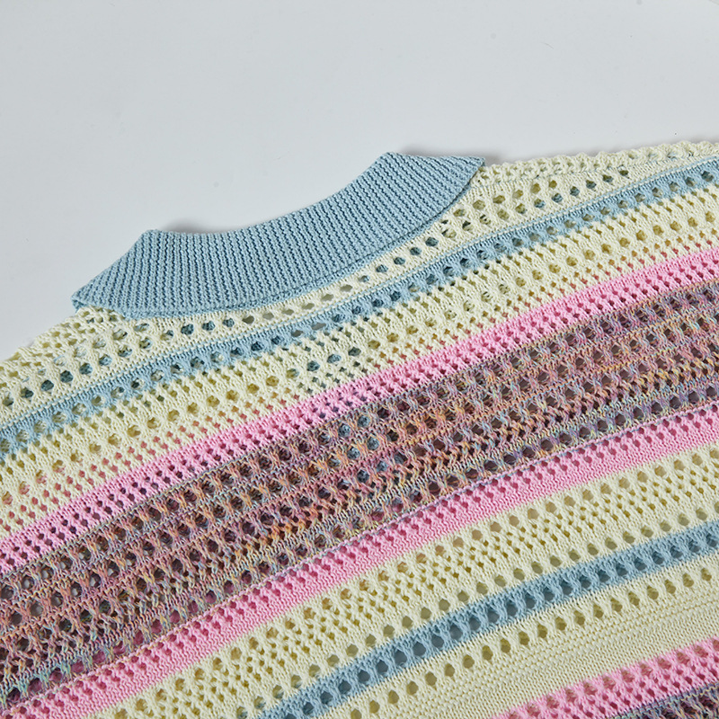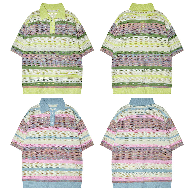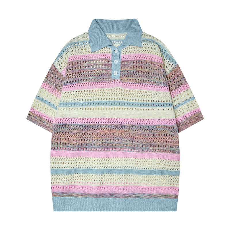 Retro Striped Gradient Floral Summer Hollow-out Shirt Unisex Couple Ins Versatile Loose Casual Top