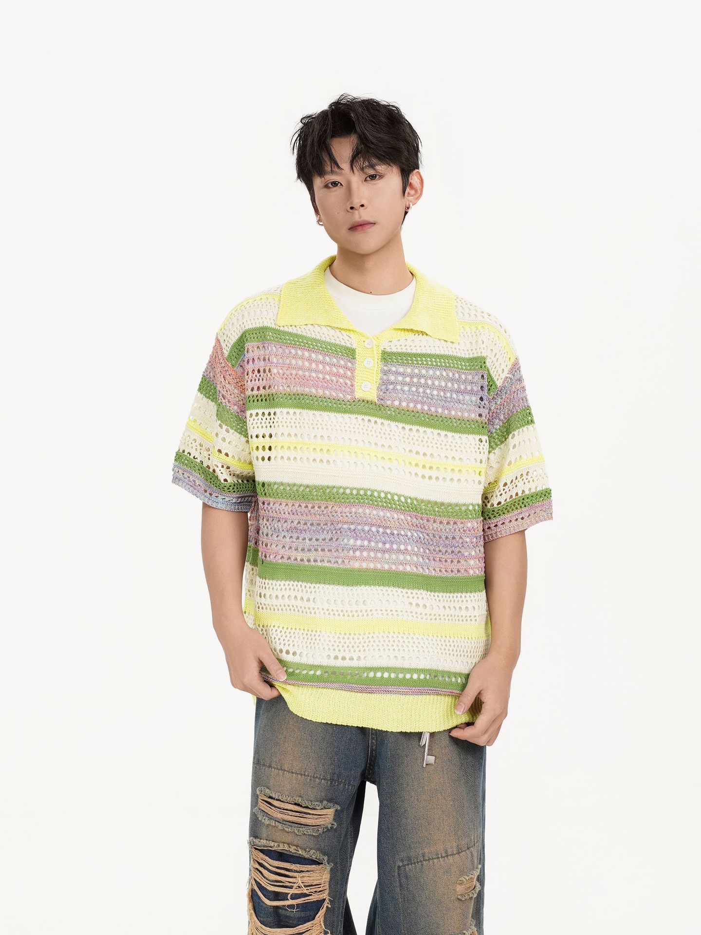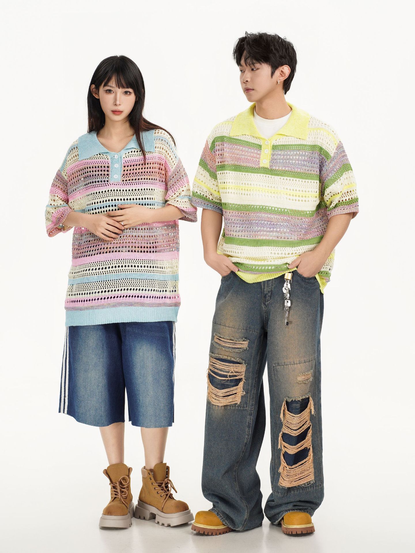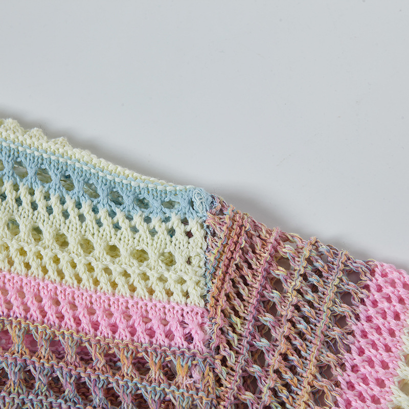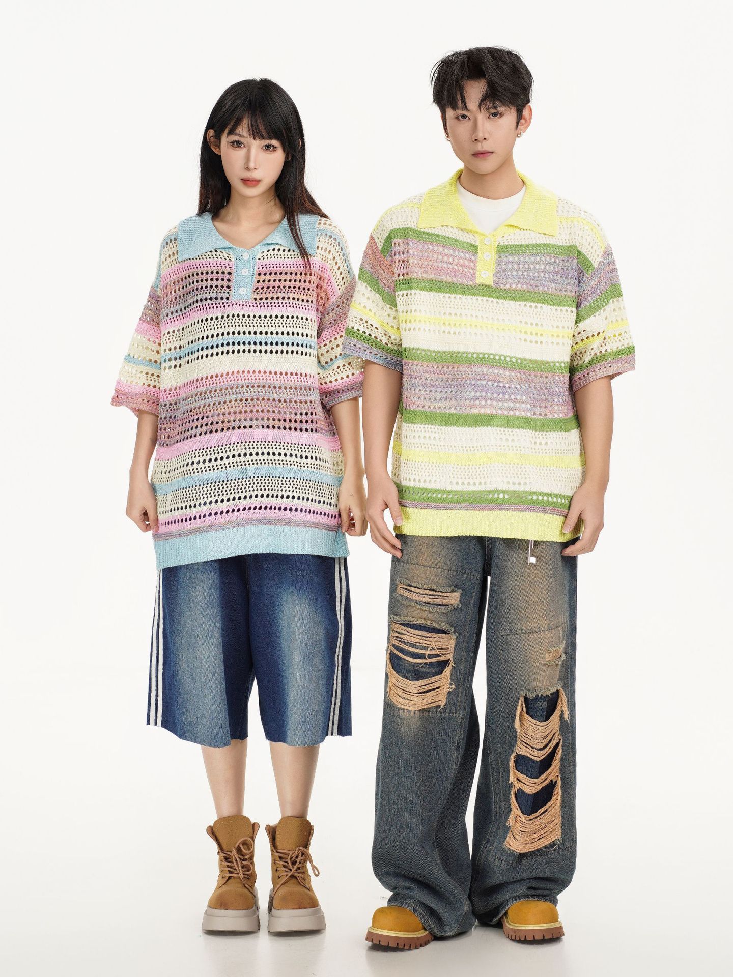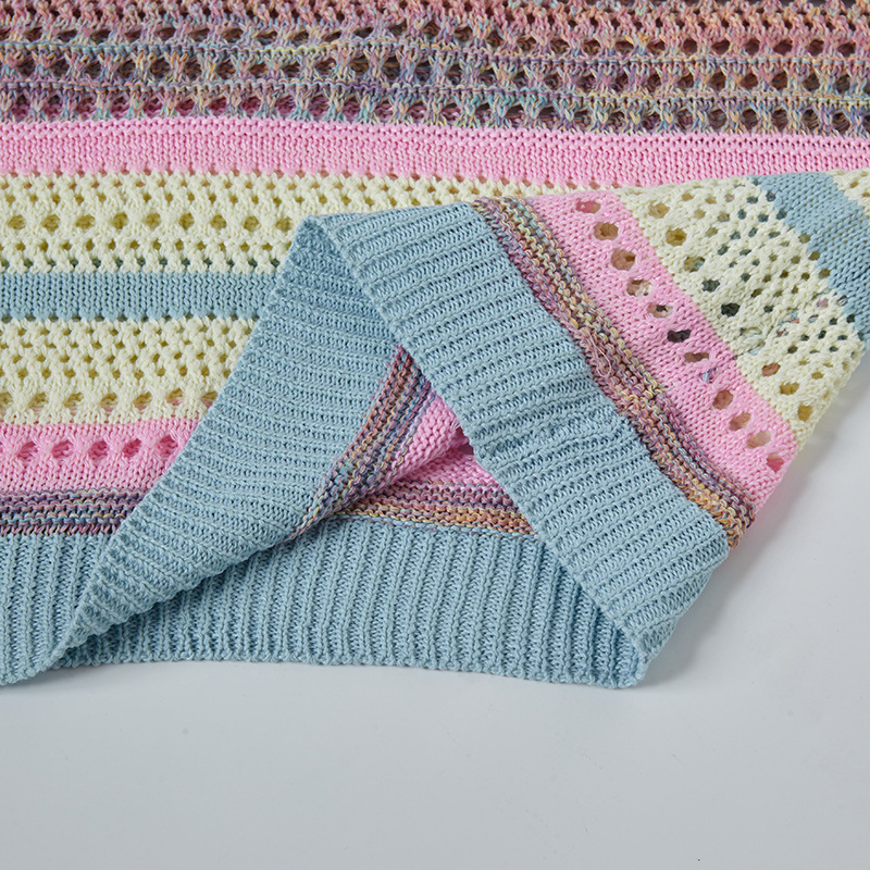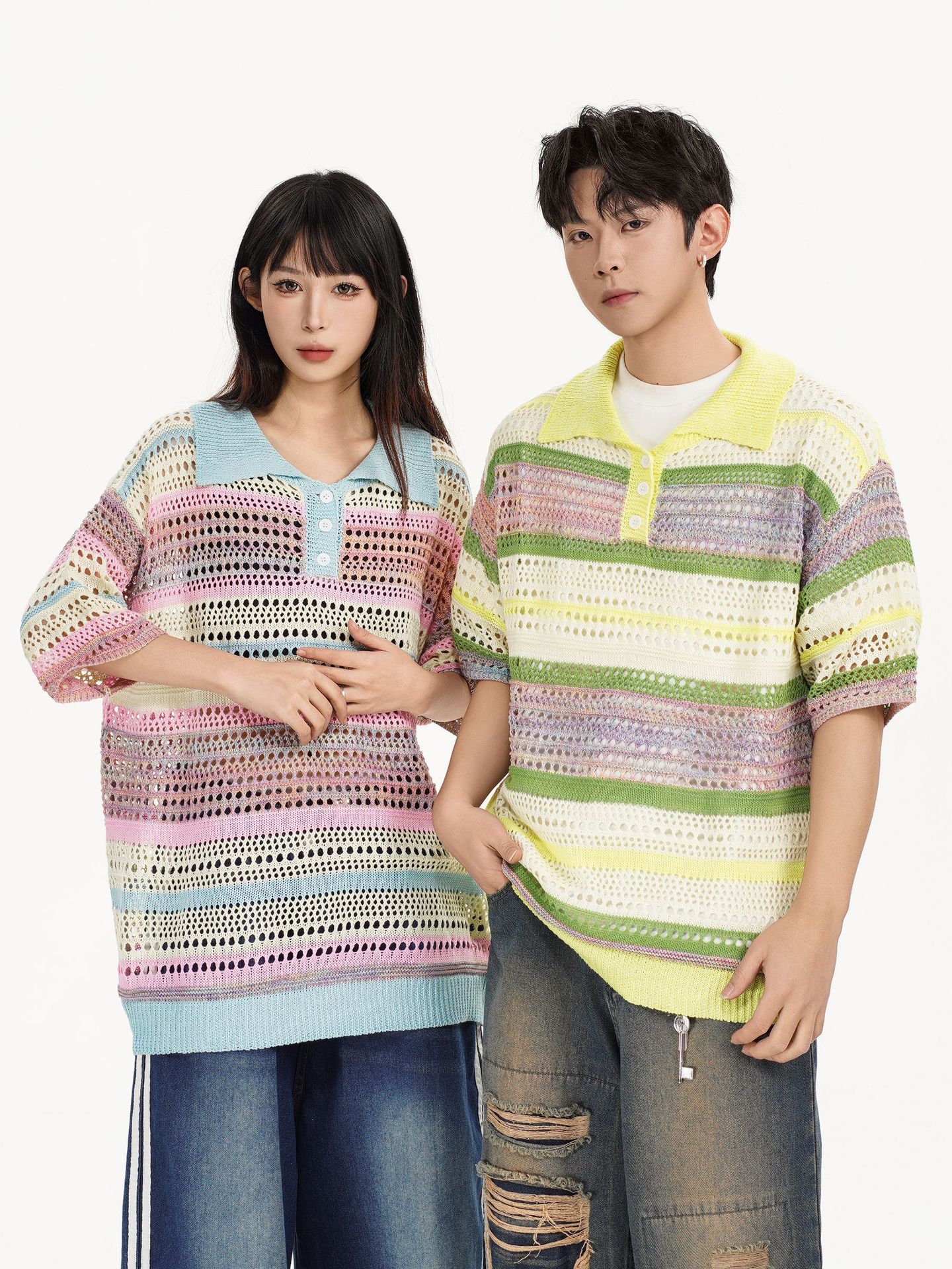 Retro Striped Gradient Floral Summer Hollow-out Shirt Unisex Couple Ins Versatile Loose Casual Top