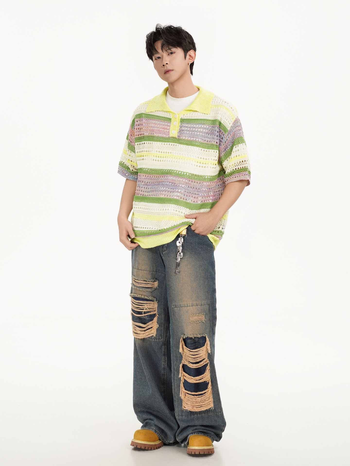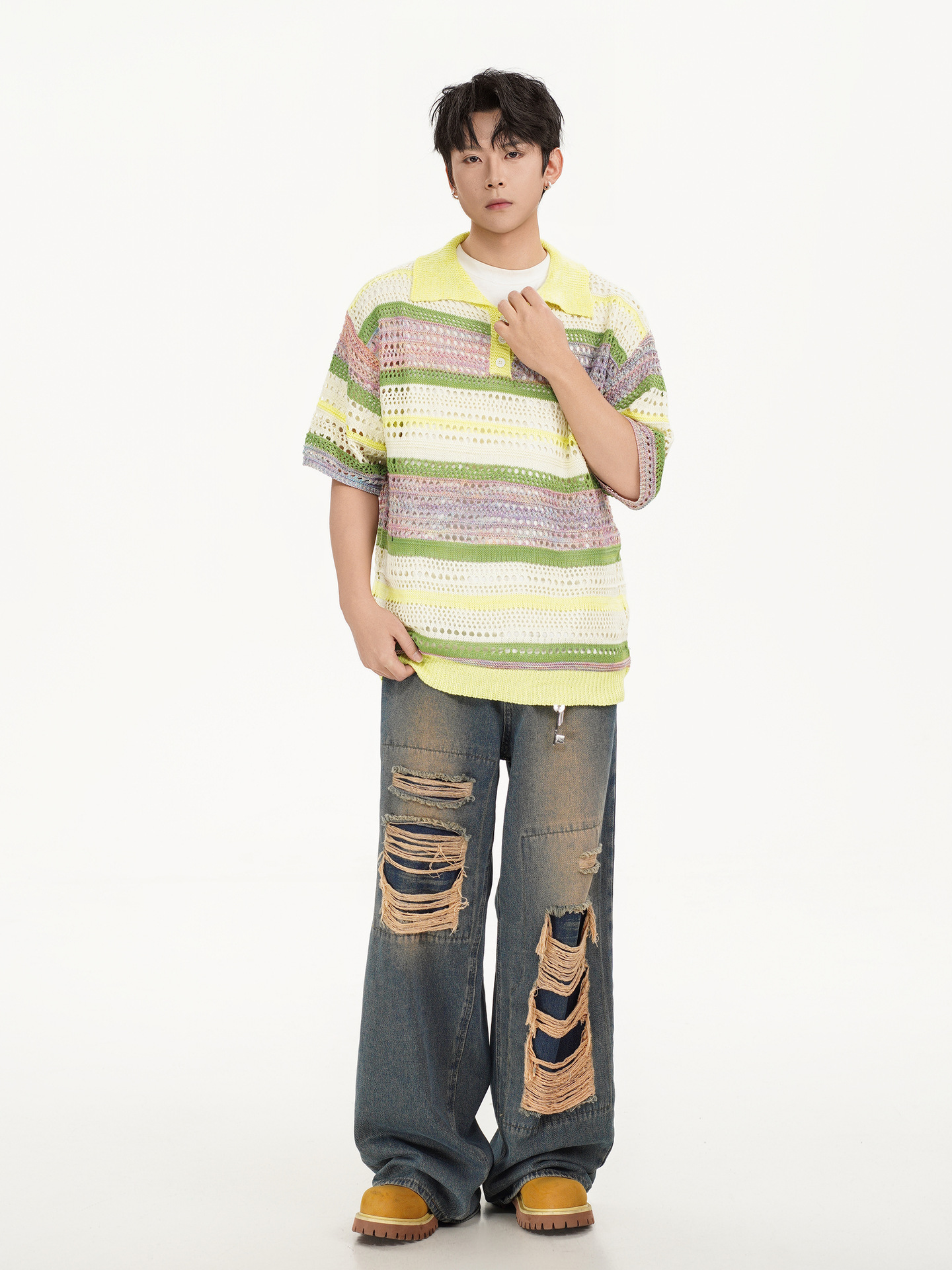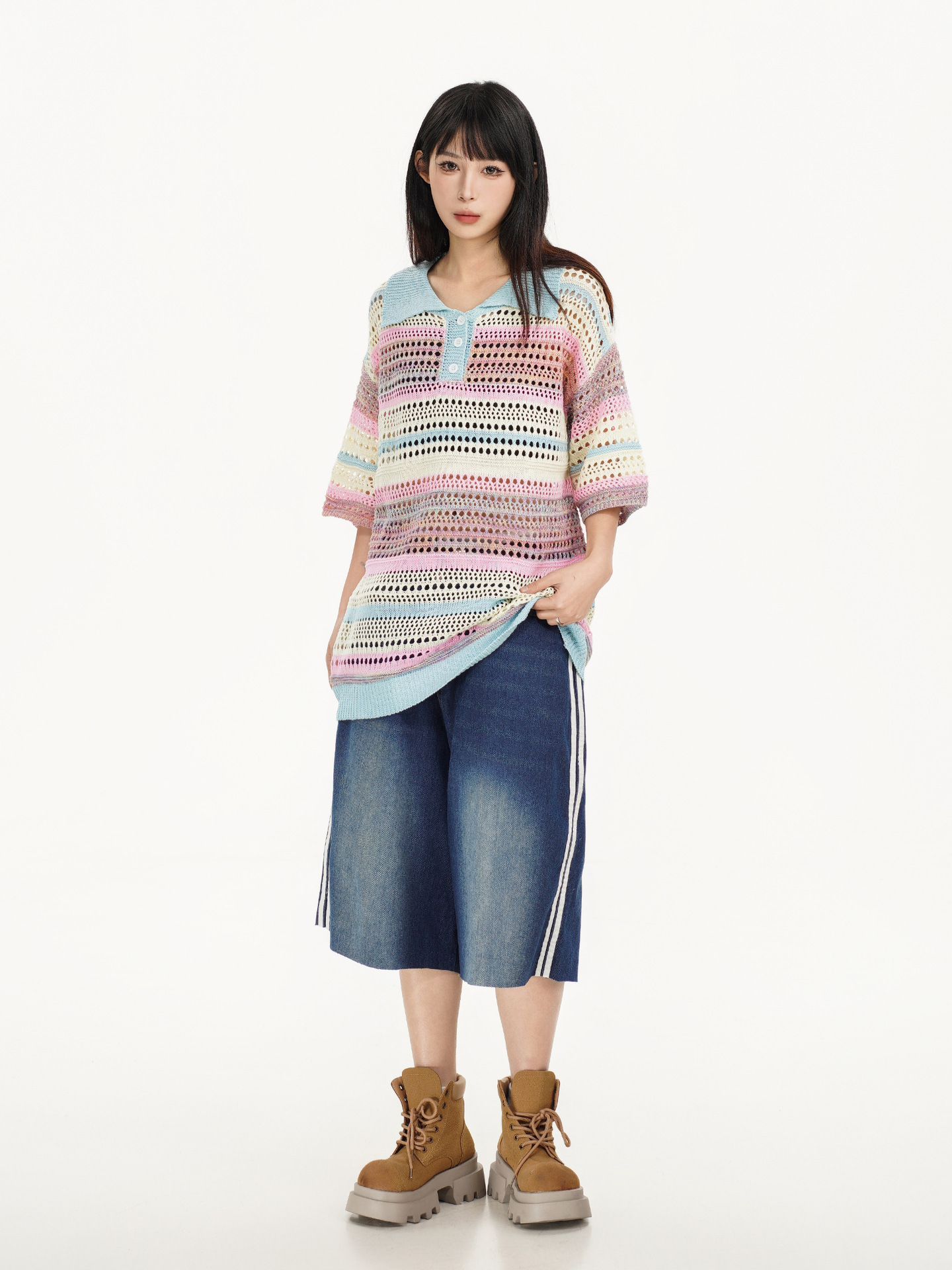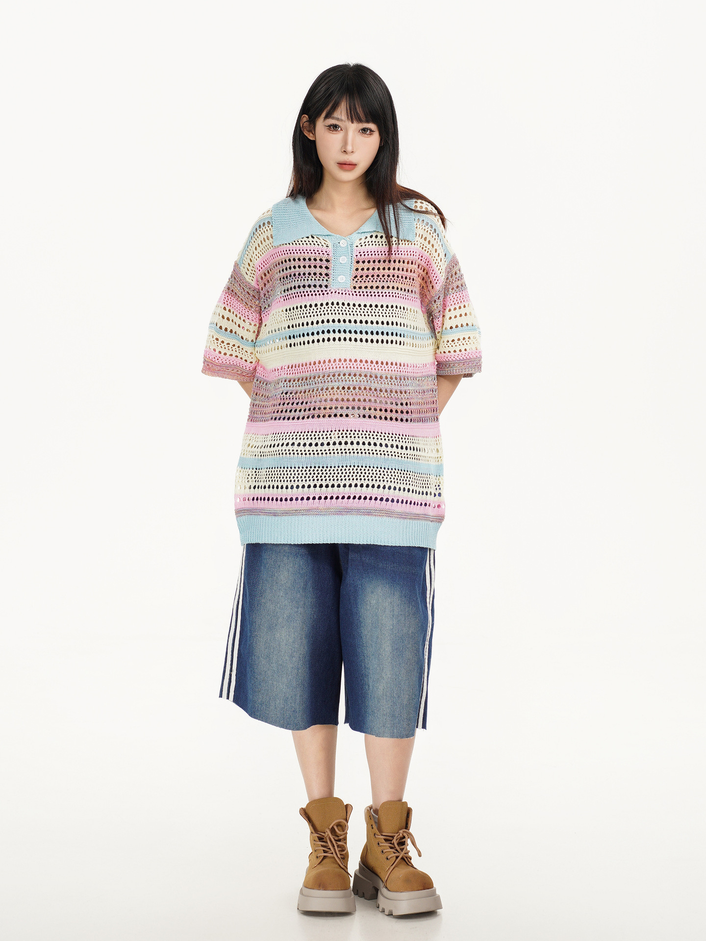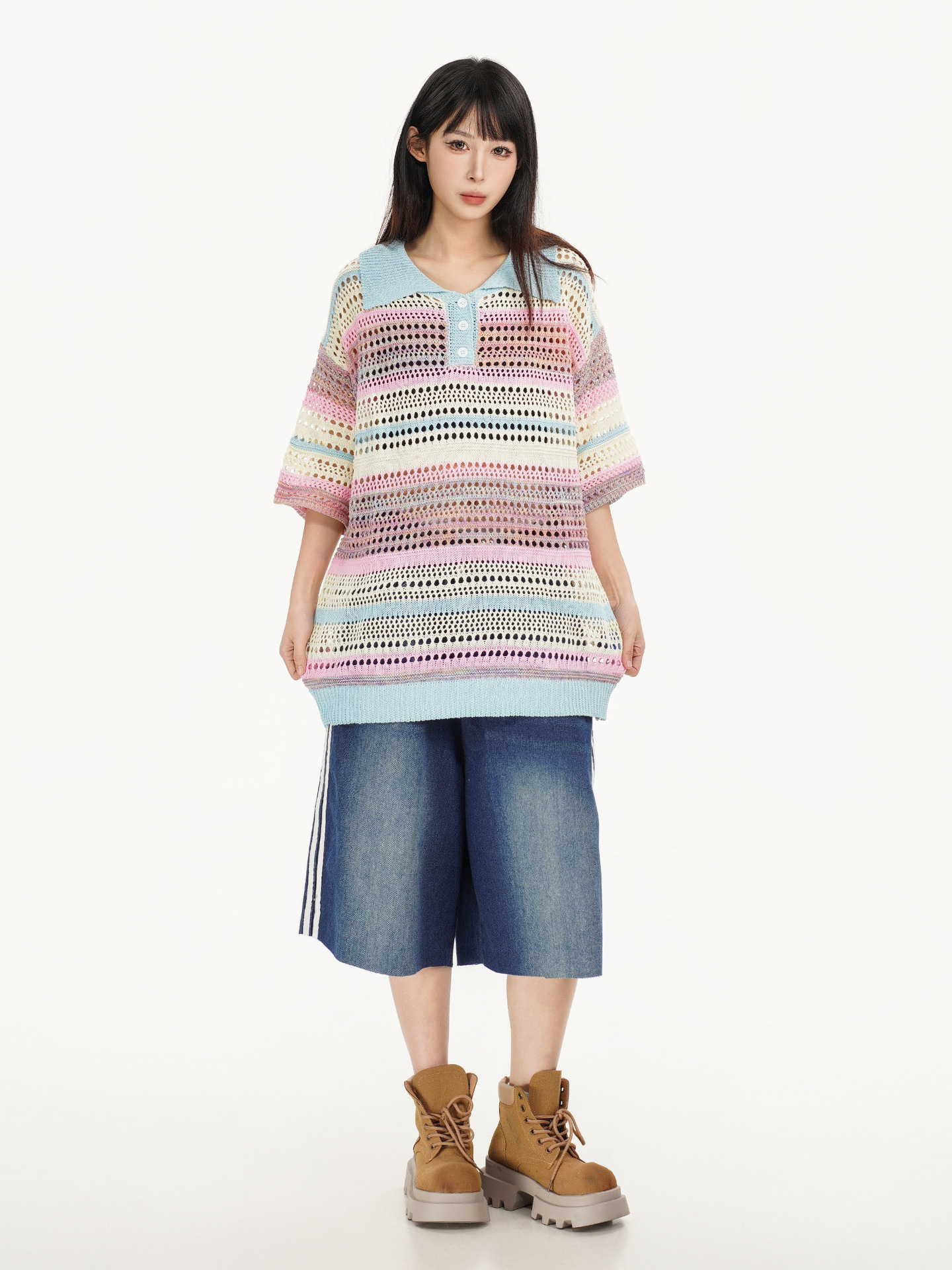 Retro Striped Gradient Floral Summer Hollow-out Shirt Unisex Couple Ins Versatile Loose Casual Top