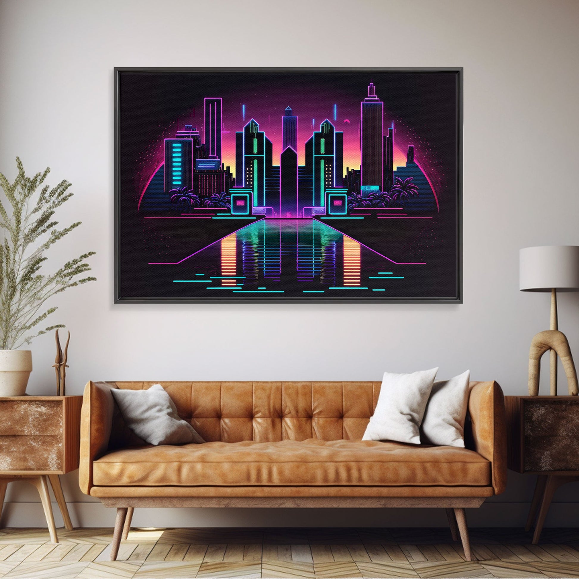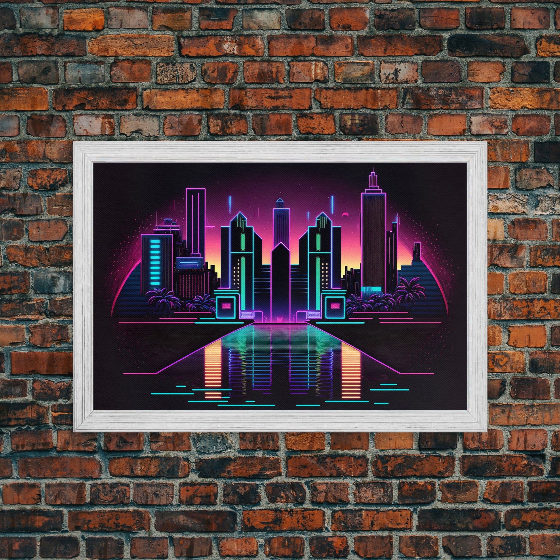Retro Style Synthwave Wireframe City, Outrun Style, Framed Canvas Print, 80s Vibes Art