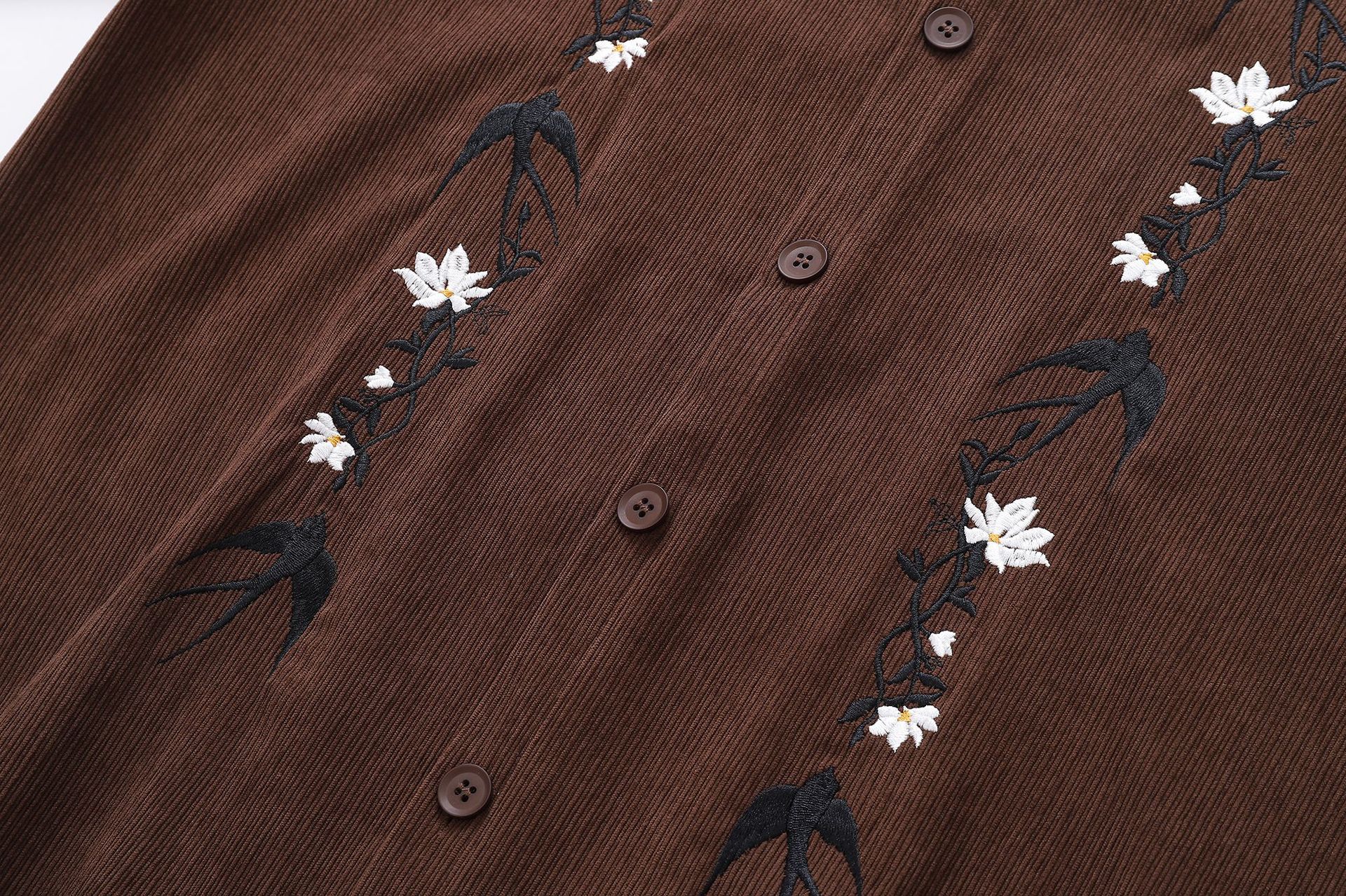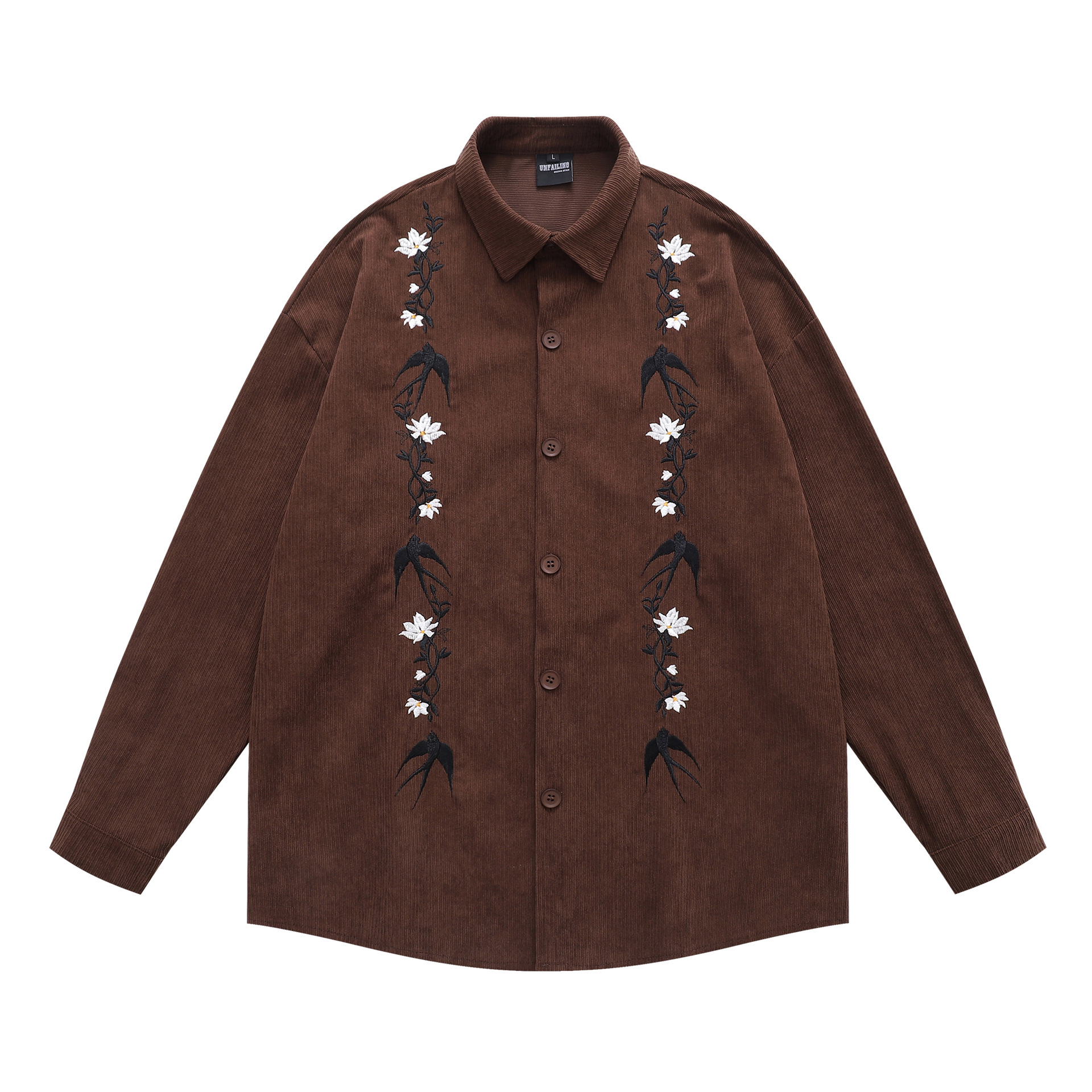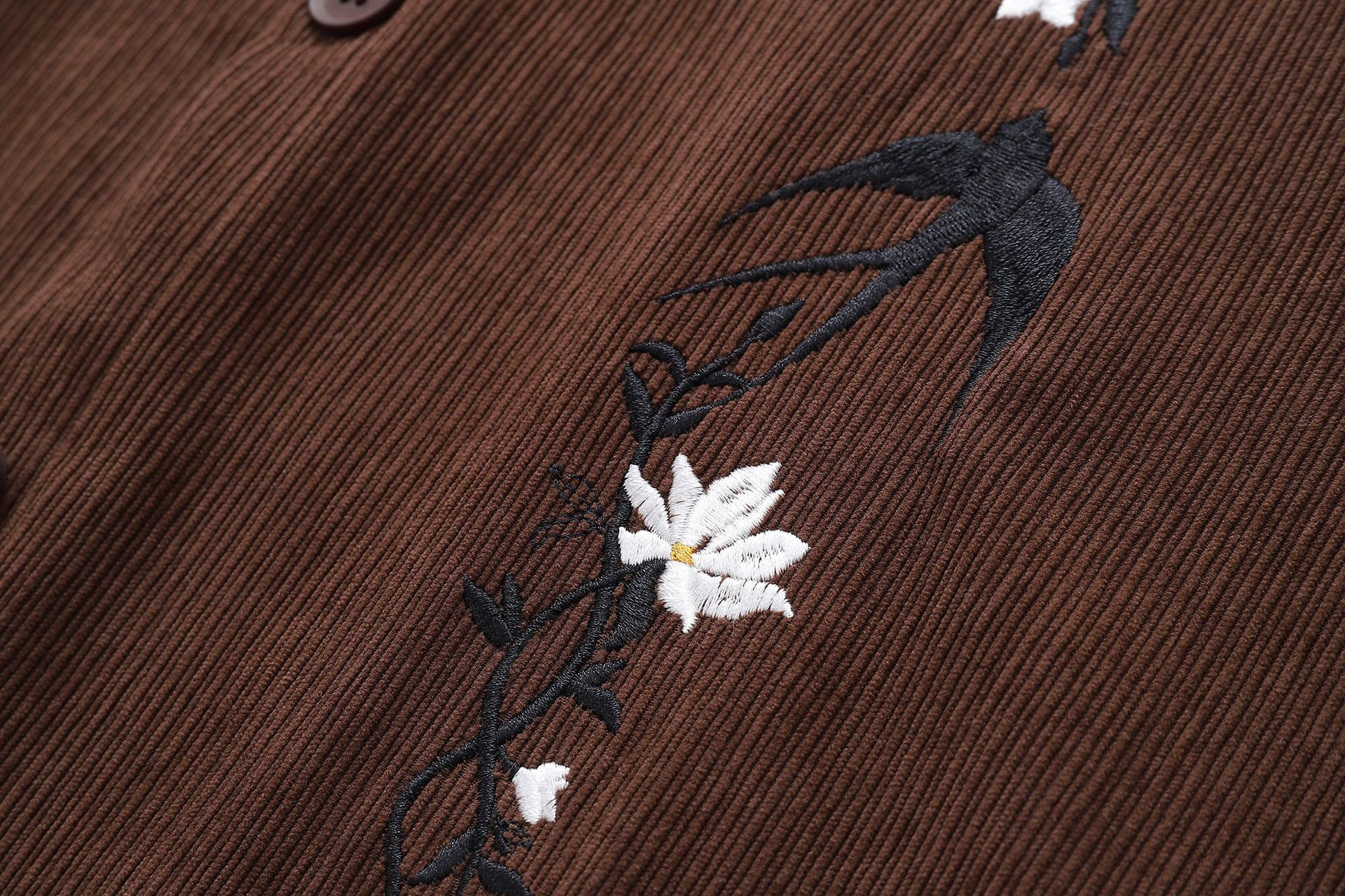 Retro Swallow Floral Embroidery Corduroy Long Sleeve Shirt Unisex Loose Couple Shirt Jacket