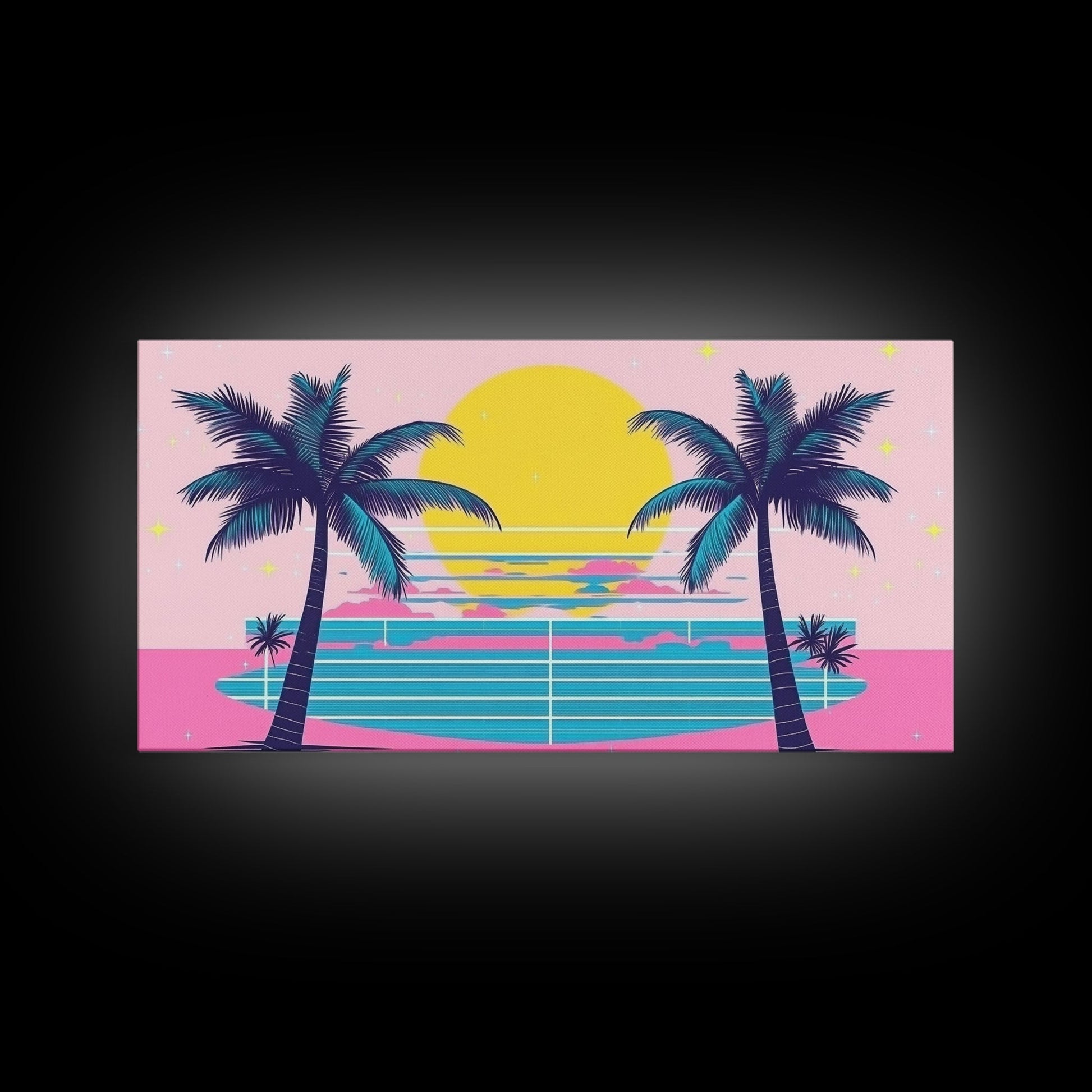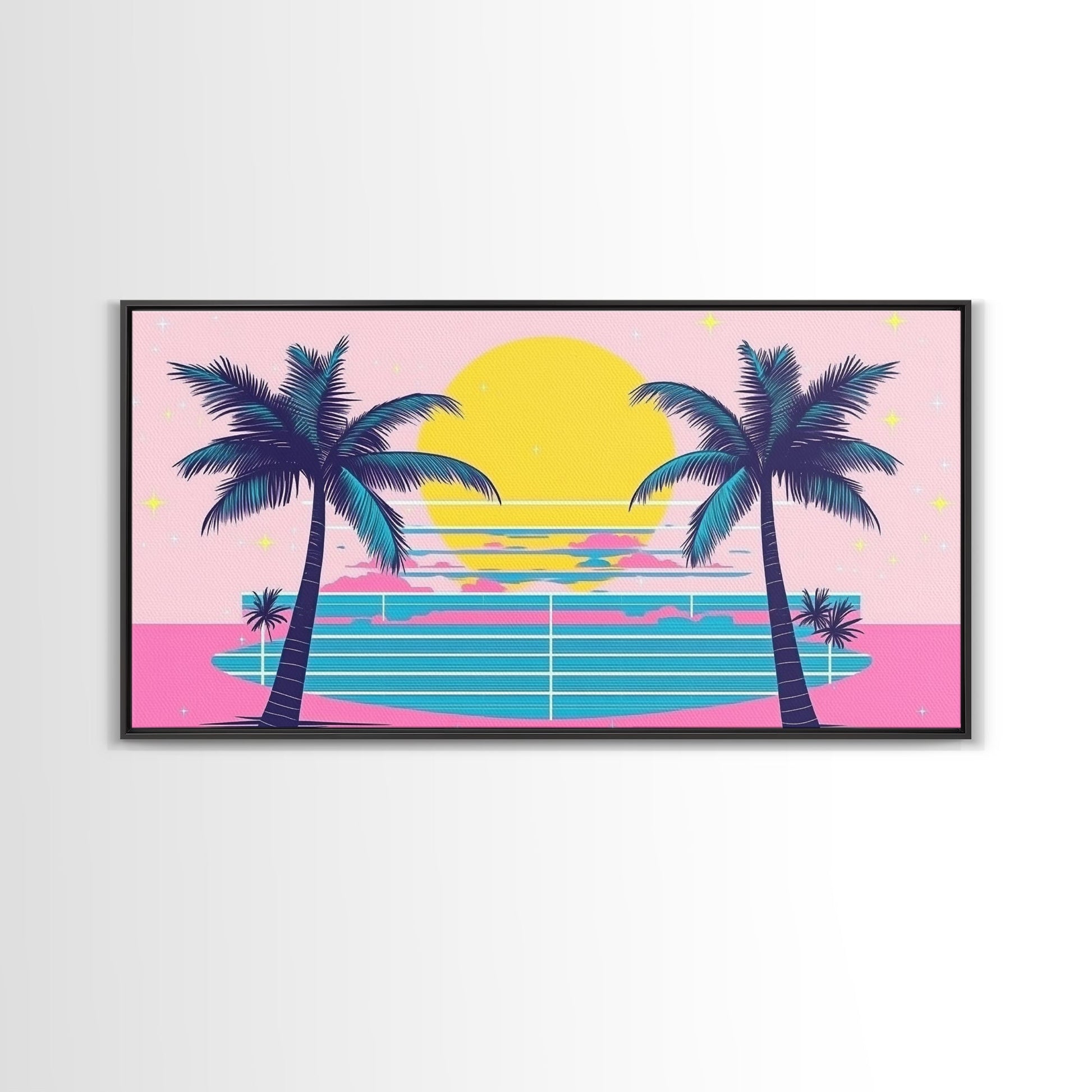 Retro Synthwave Wall Art, Outrun Home Decor Framed Canvas Print, Two Palm Trees and a Sunset