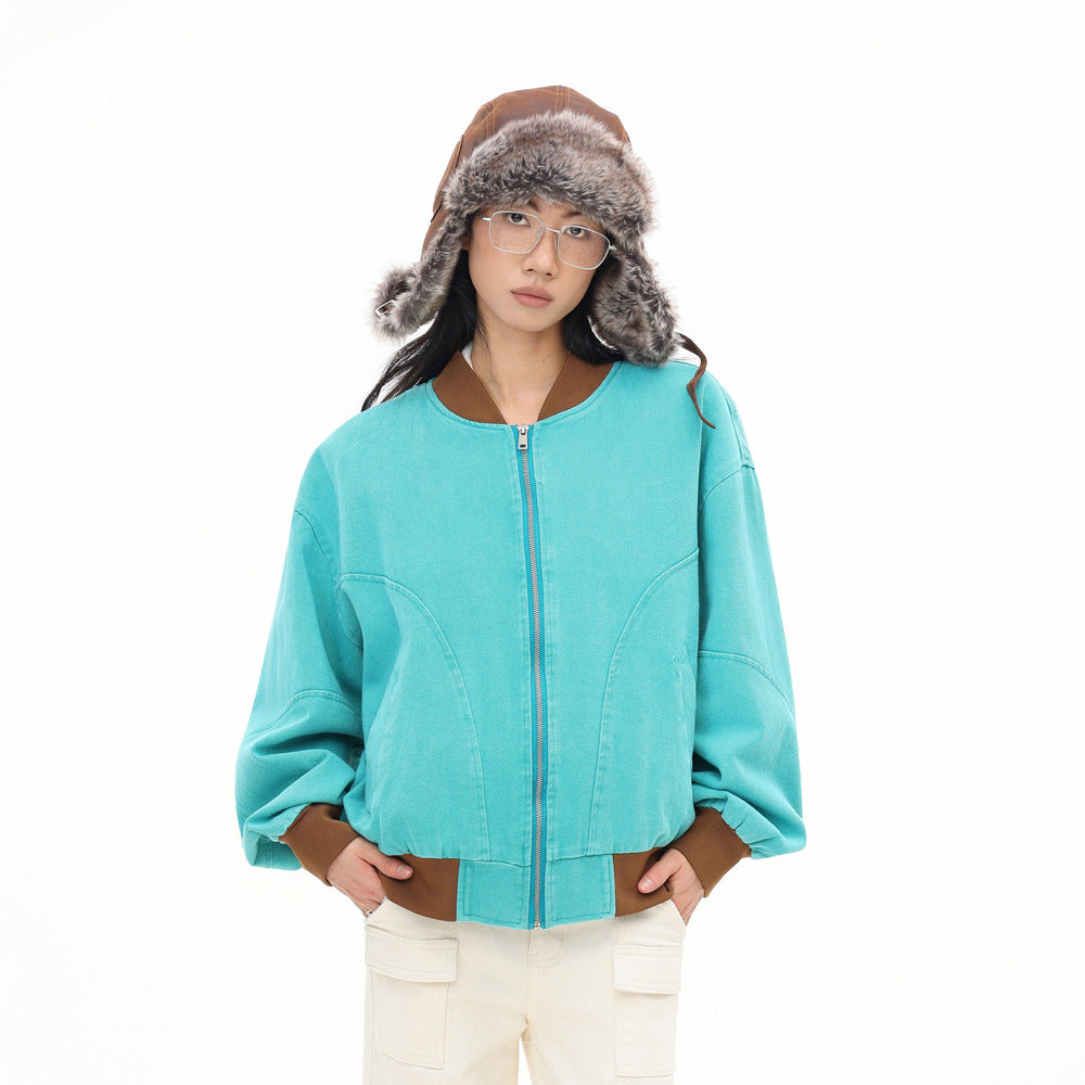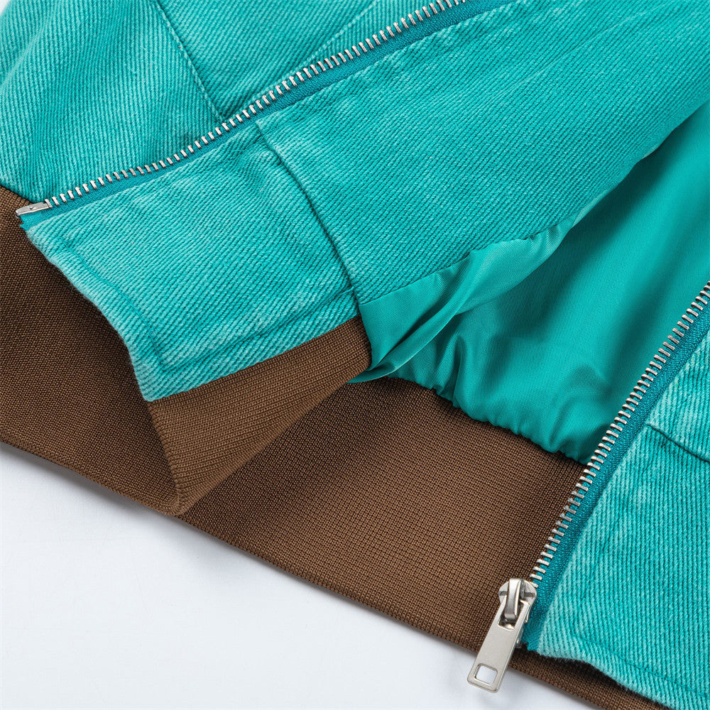 Retro Workwear Denim Jacket Men's Baseball Jacket Color Block Splicing Stand Collar Loose Short Coat