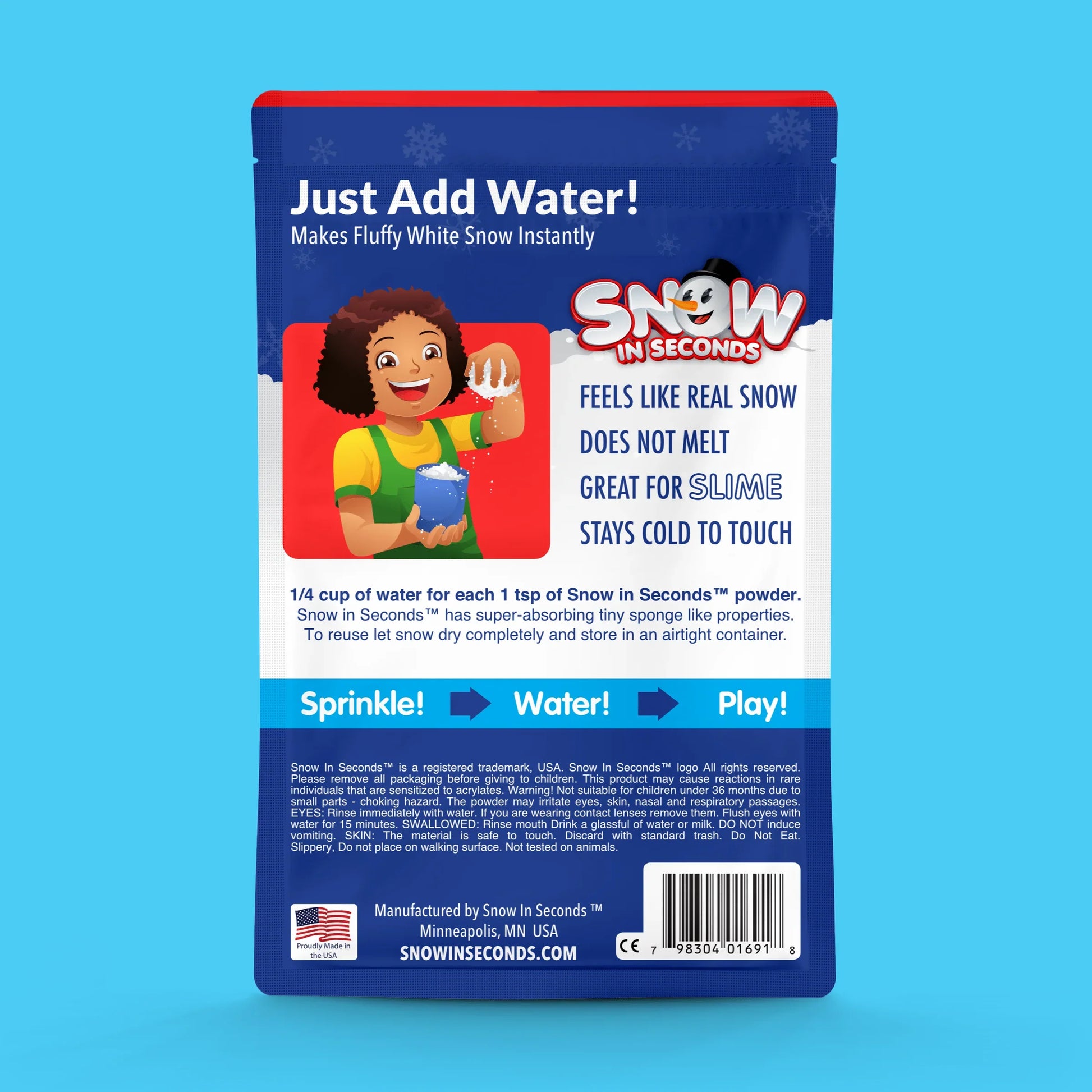 Snow in Seconds fake snow is a powder with super-absorbing "tiny sponge" properties. It is safe, non-toxic, and will "erupt" into snow when you add water - Instantly! Snow in Seconds is long lasting, never melts and is so realistic it is cold to the touch! It is used at ski resorts, in photo shoots, and by movie makers to create realistic snow. Snow in Seconds makes it easy for you to bring the high tech powder used by professionals in movies into your home affordably!