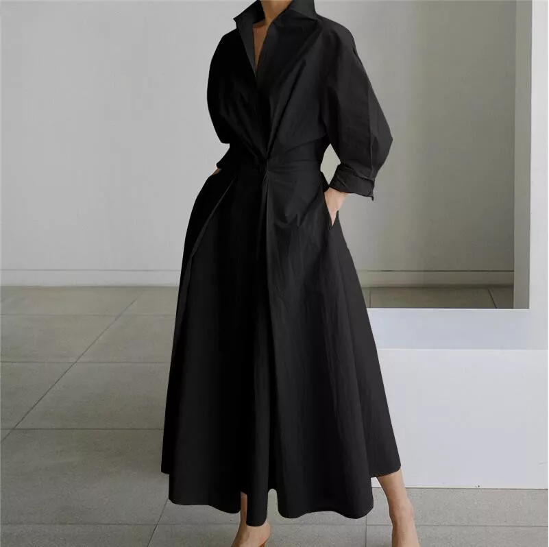 Summer Women's Dress Fashion Commuter Solid Color Women's Retro Lapel Elastic Waist Shirt Long Sleeve Big Swing Women's Dress