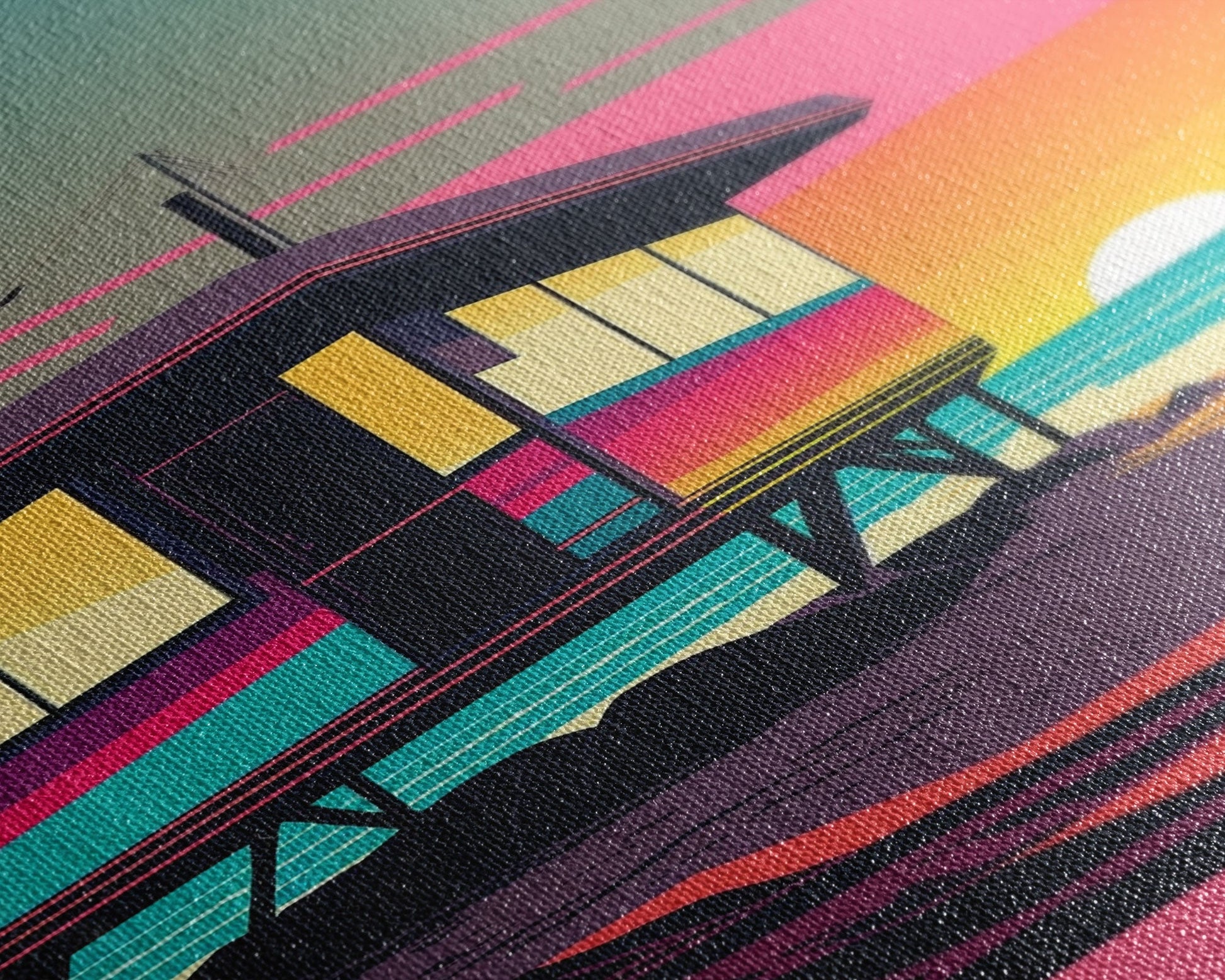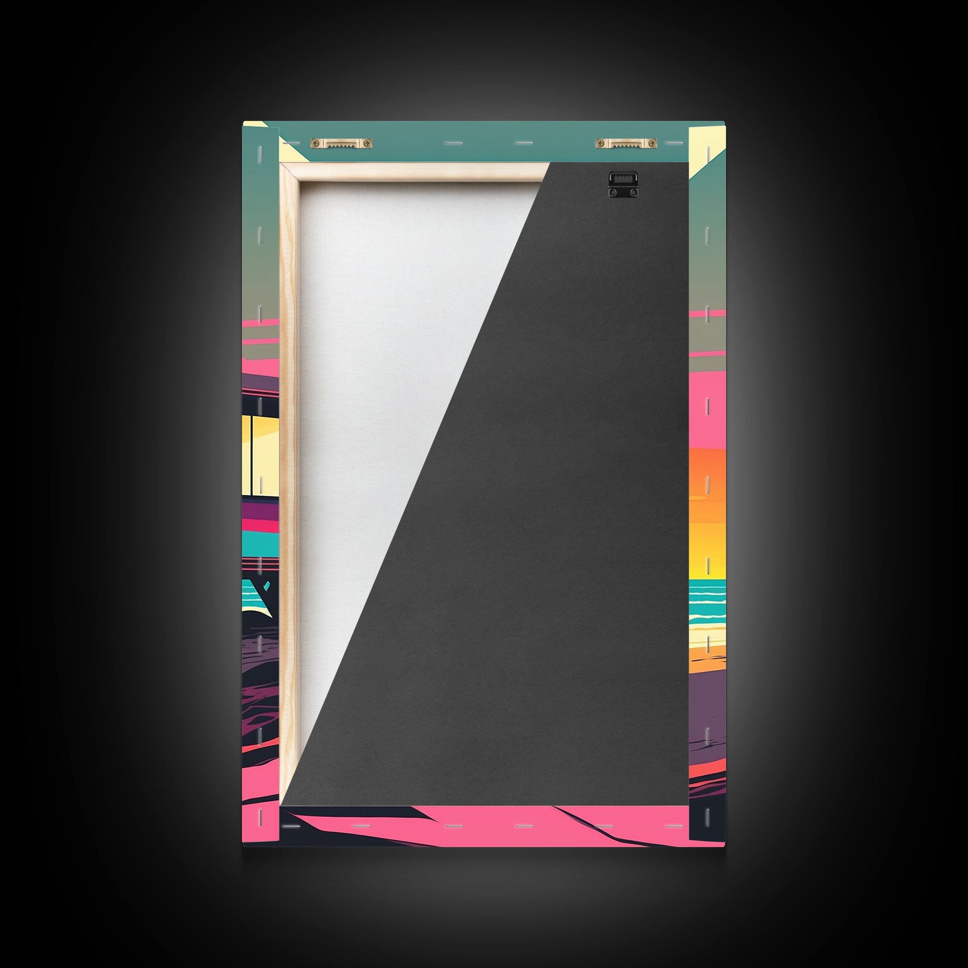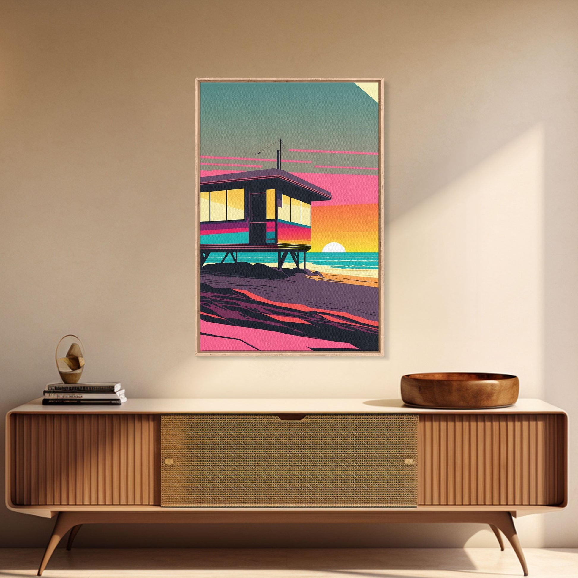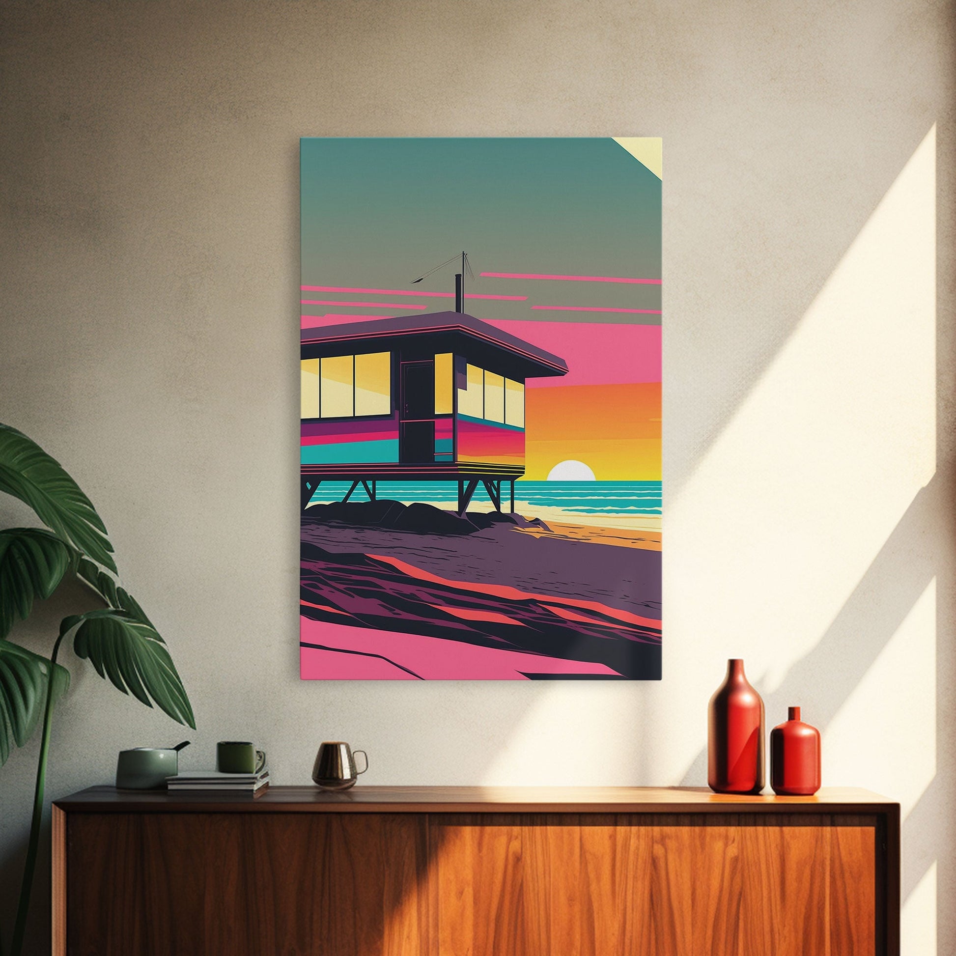 Synthwave Sunset Beach California Lifeguard Hut Framed Canvas Print, Retro Style, 80s Vibes, Turquoise Beach Art