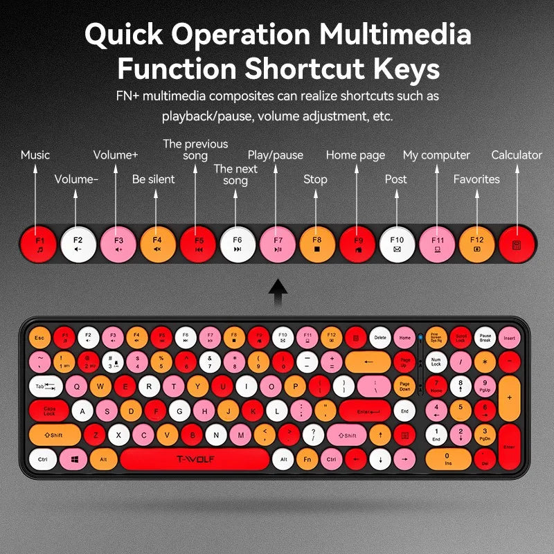 T-WOLF Thunder Wolf TF350 Wireless Keyboard and Mouse Set for Girls, Colorful Punk Retro Mouth Red Round Key Cap