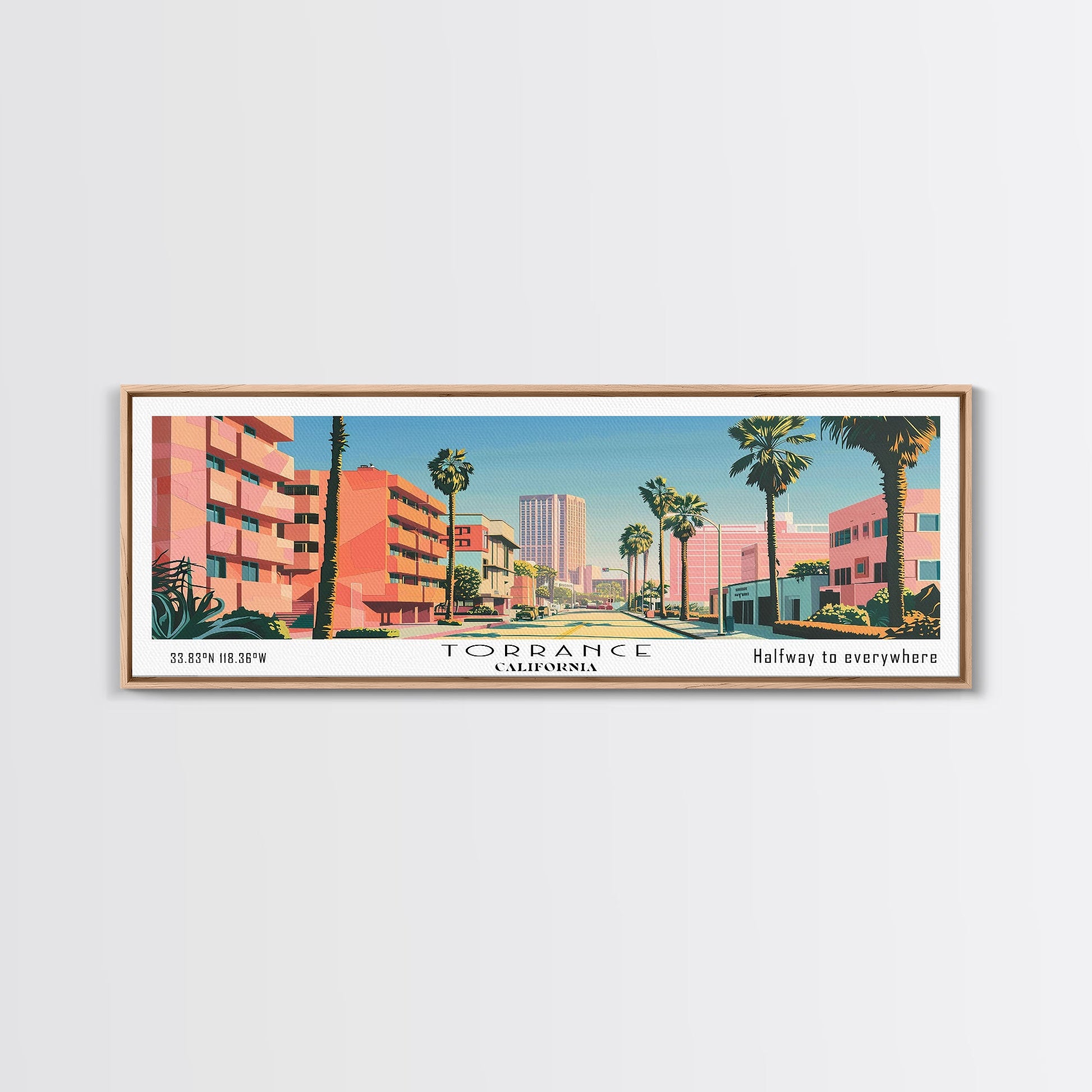 Torrance California Panoramic Wall Art, Mid Century Modern Framed Canvas Print, Retro Pop Art Travel Poster, Living Room and Office Decor