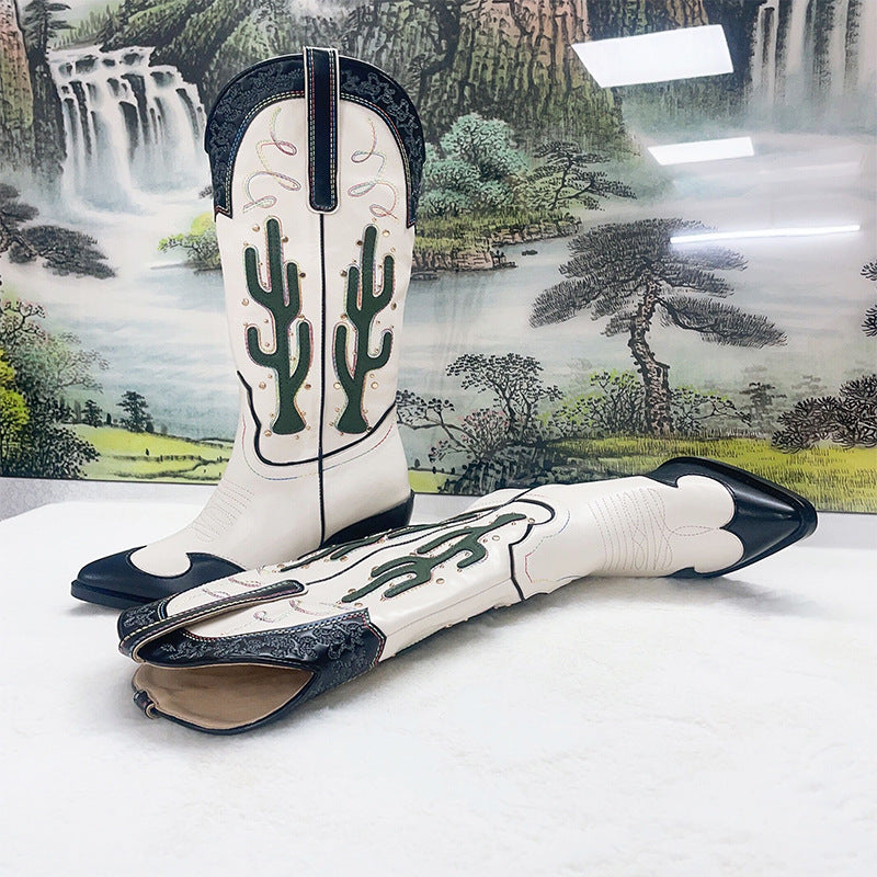 Western Cowboy Mid Calf Women Boots Chunky High Heels Cactus Vintage Cowgirl Long Boots Retro Shoes Woman