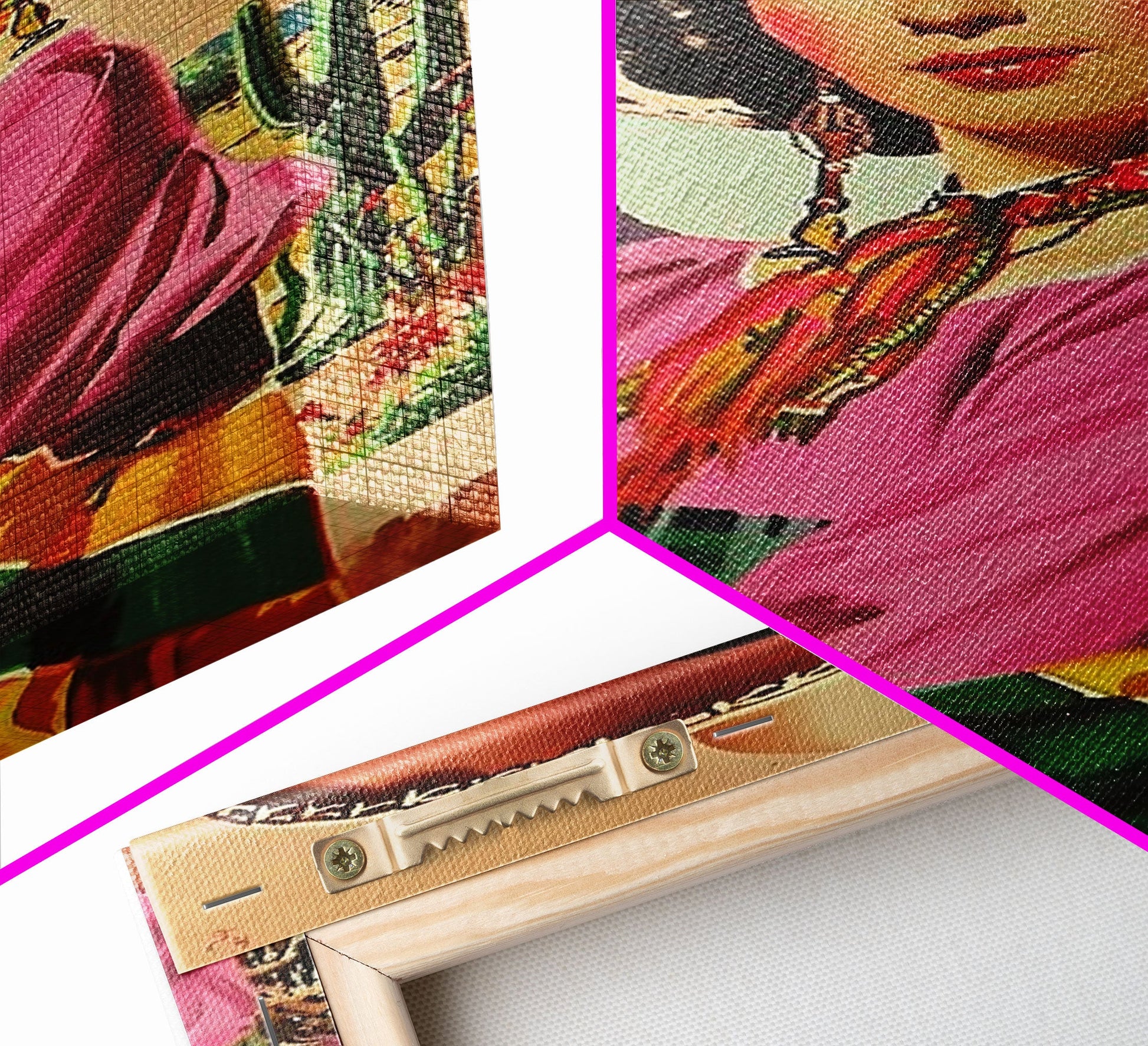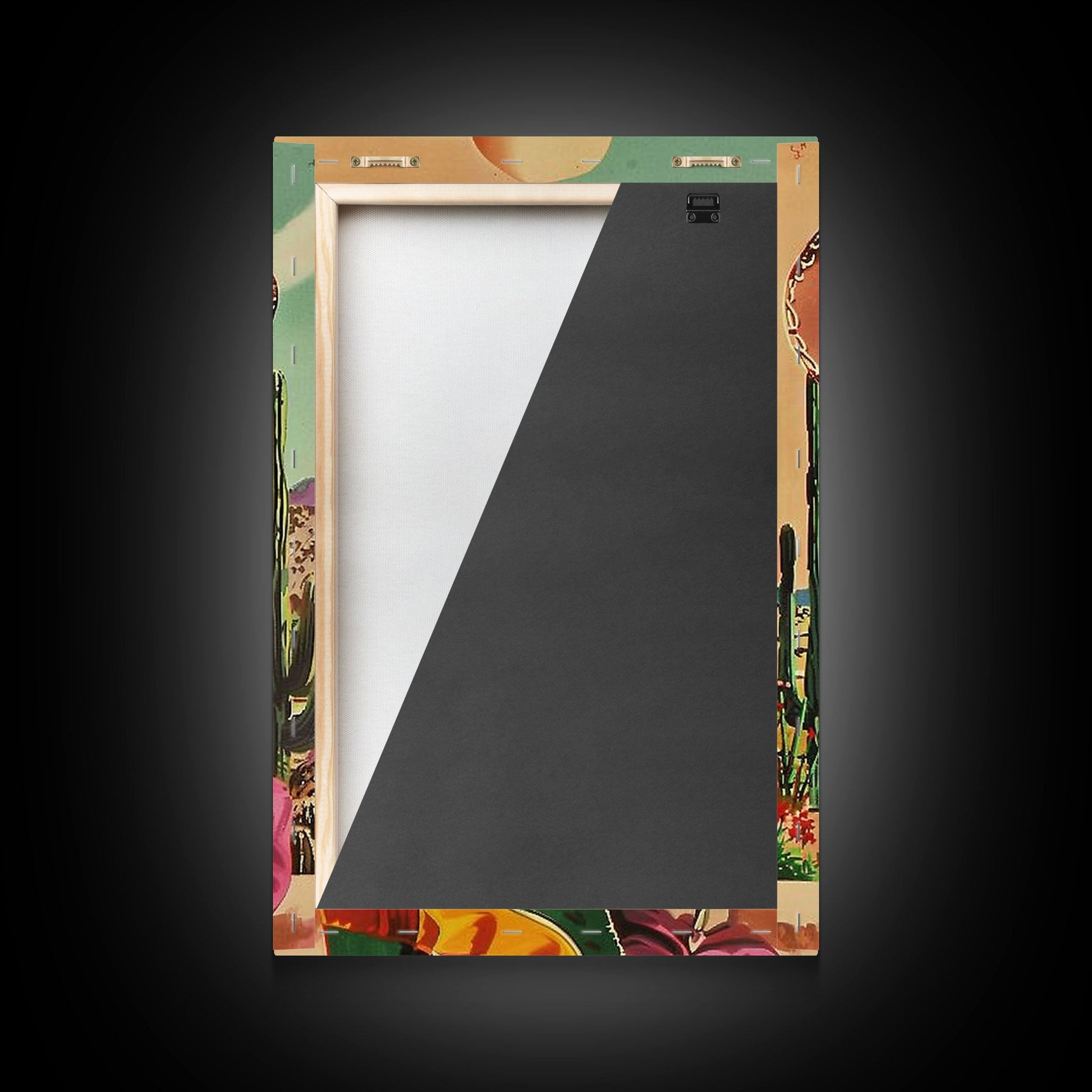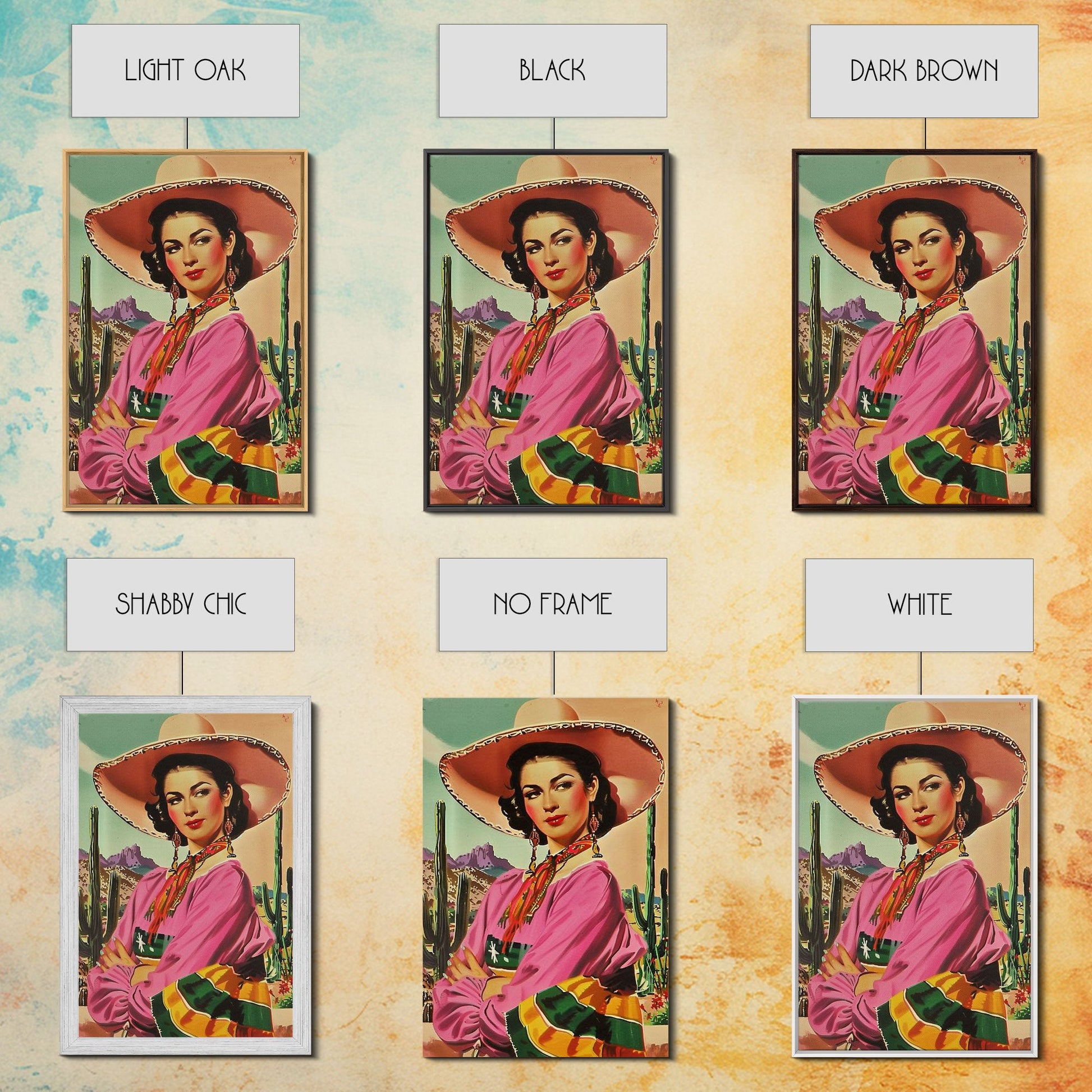 Western Portrait of a Latina Cowgirl with Cactus Background - Framed Canvas Print, Southwest Living Room Art Rustic Bedroom Decor, Retro Art