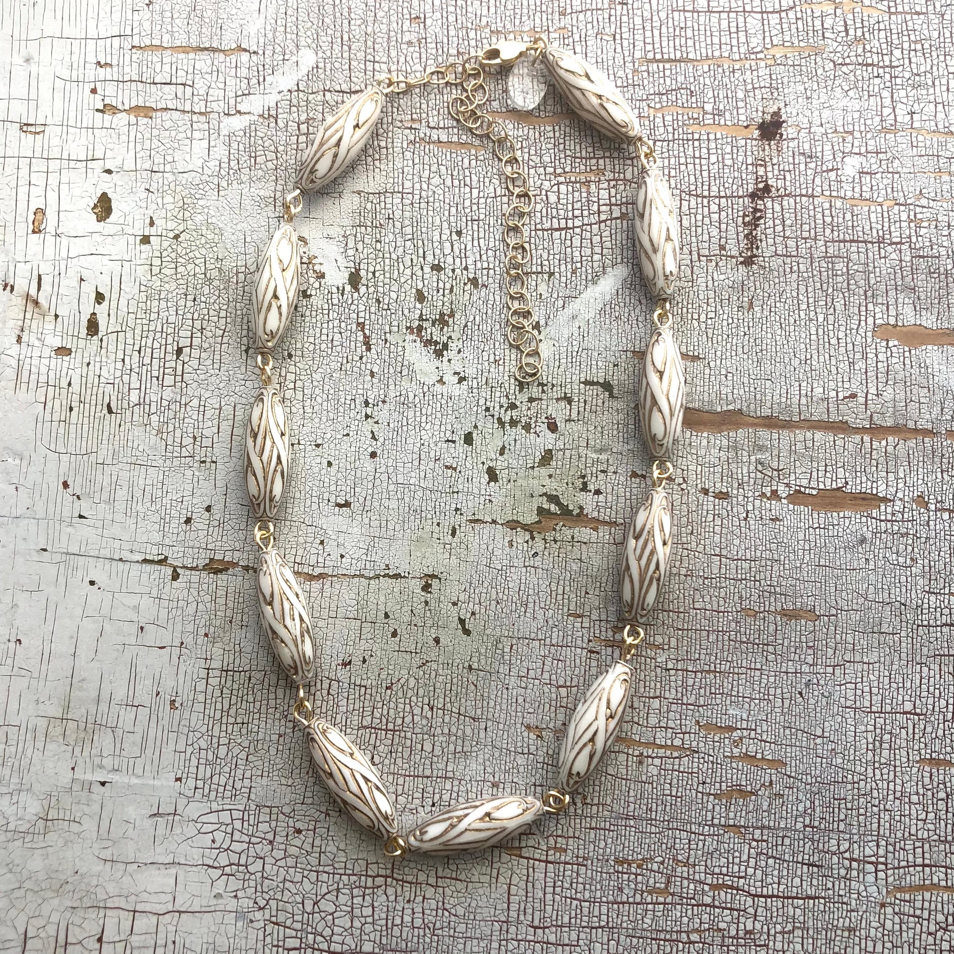 Incredibly regal, gold lined art nouveau white beads shine in this hand-wired necklace. This style is known as the Amelia necklace & features hand-linked beads, rosary-chain style. Measures approximately 16" + a 6" adjustable extender. Picture of model wearing another amelia for size reference.