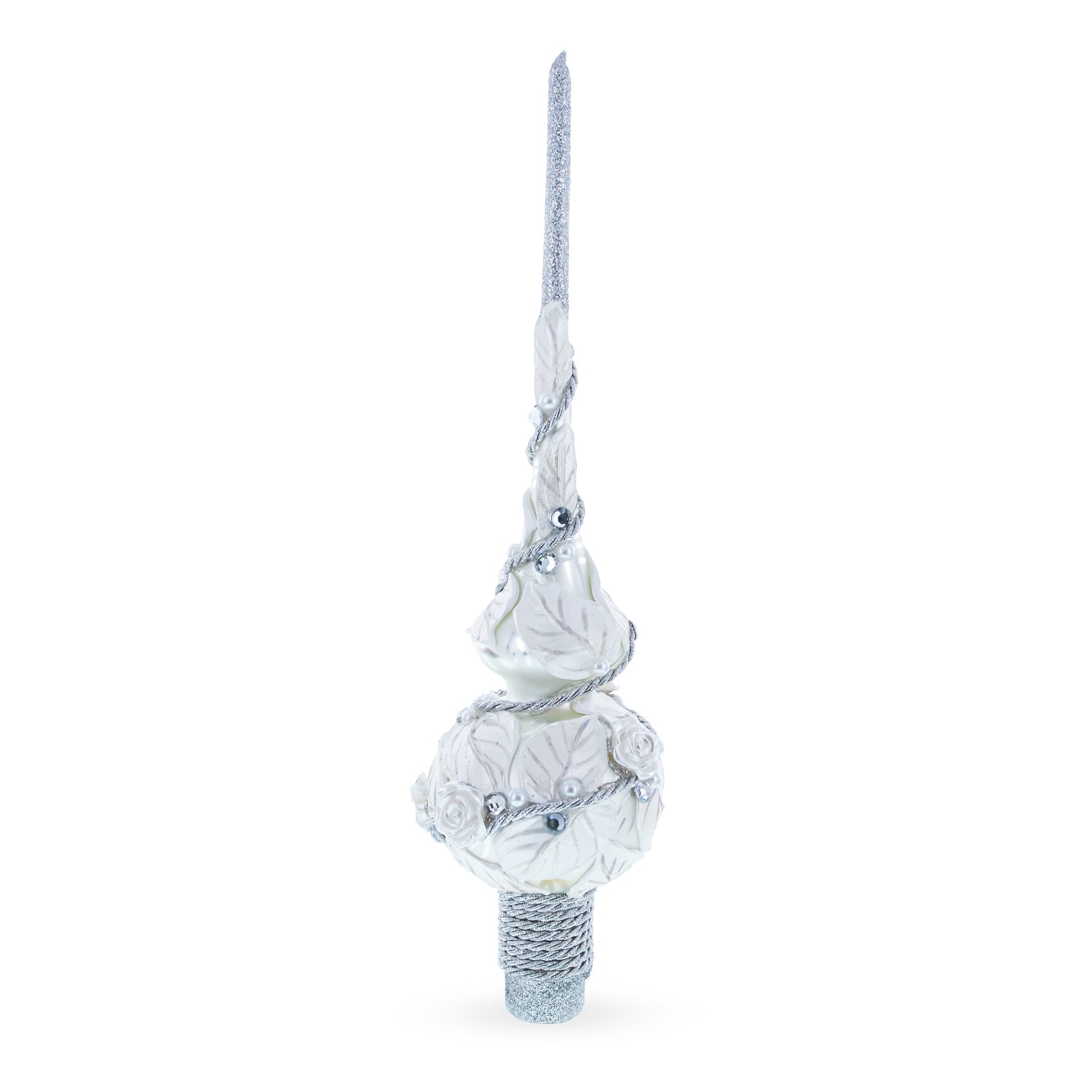 White Roses with Leaves on White Glass Christmas Tree Topper 11 Inches