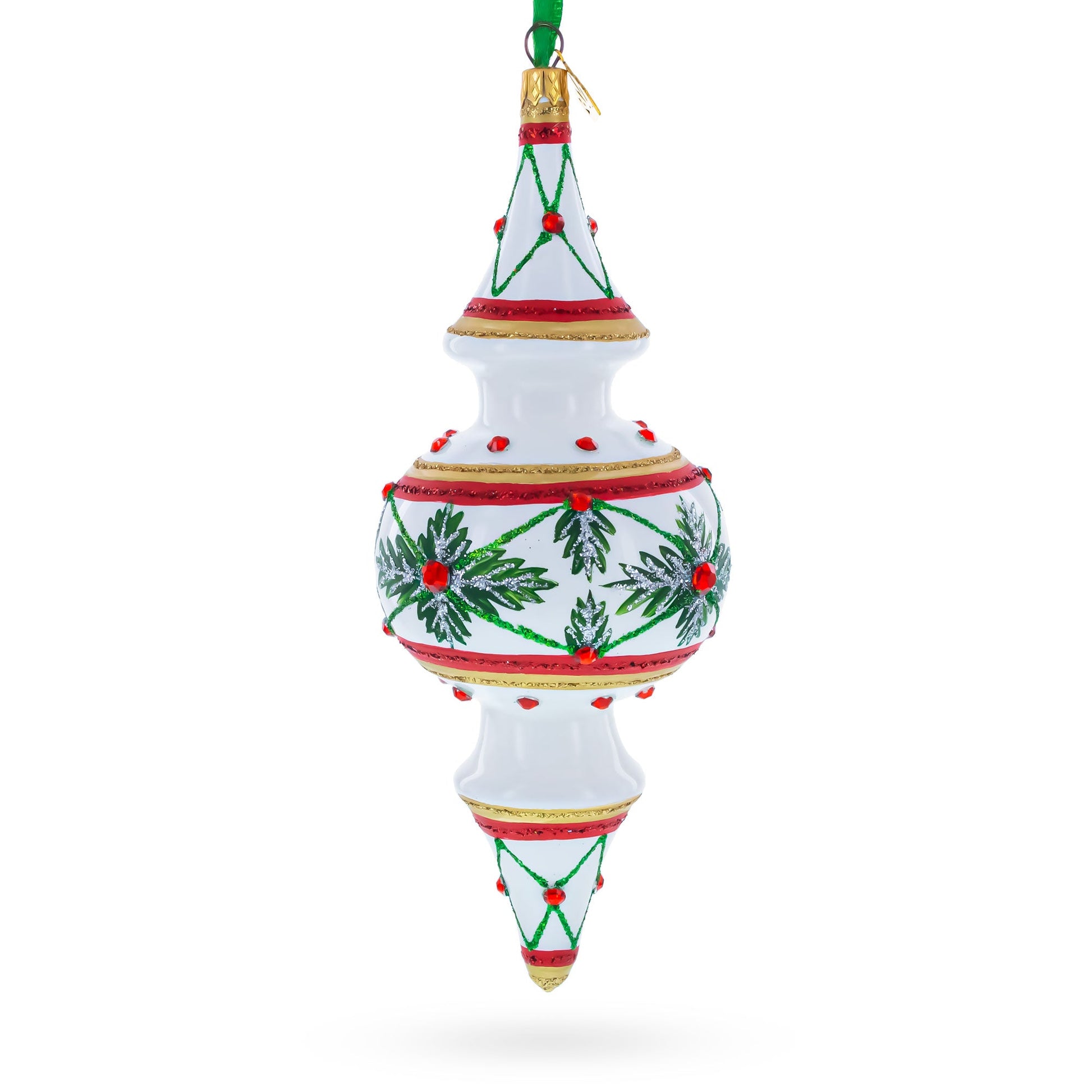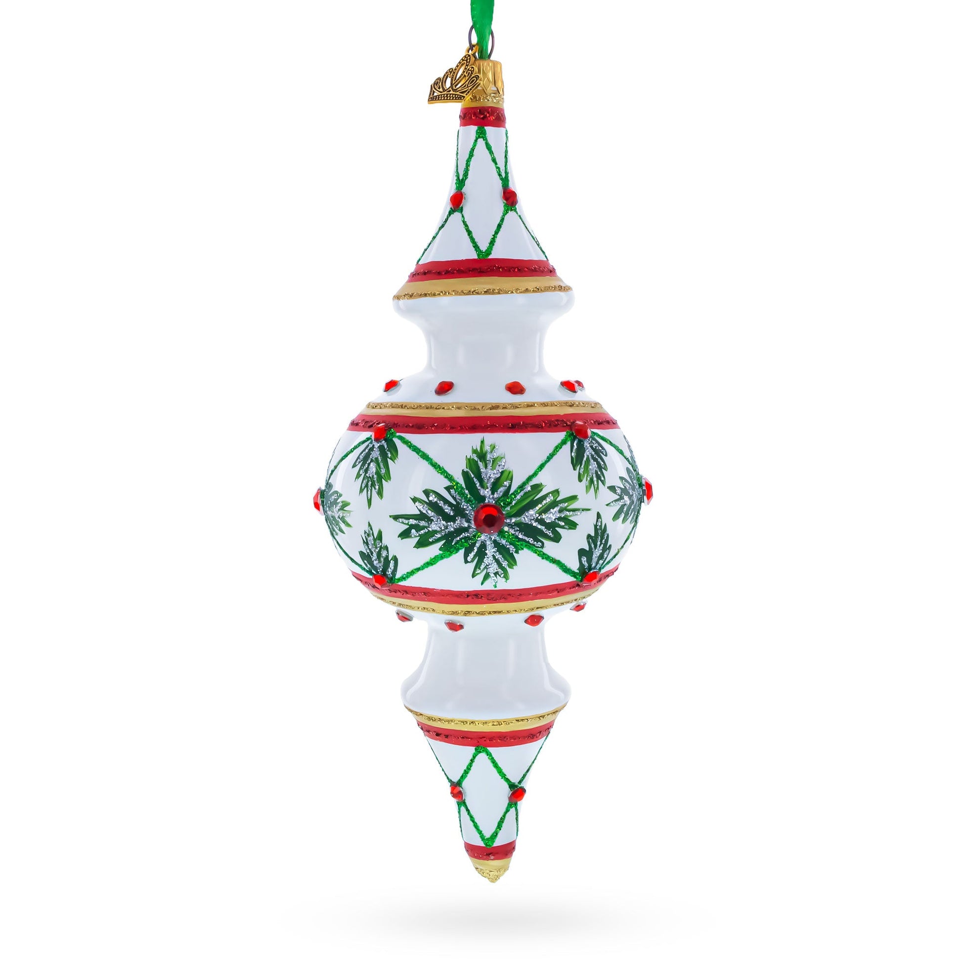 This elegant glass Christmas ornament features a unique globe finial shape with a round center and tapered top and bottom. Embellished with sparkling gemstones, intricate glitter swirls, and ornate detailing, it adds a touch of classic holiday charm to any tree. Hand-painted and crafted with old-world artistry, this festive piece reflects light beautifully, creating a luxurious and eye-catching display. Perfect for collectors or anyone looking to elevate their holiday décor.